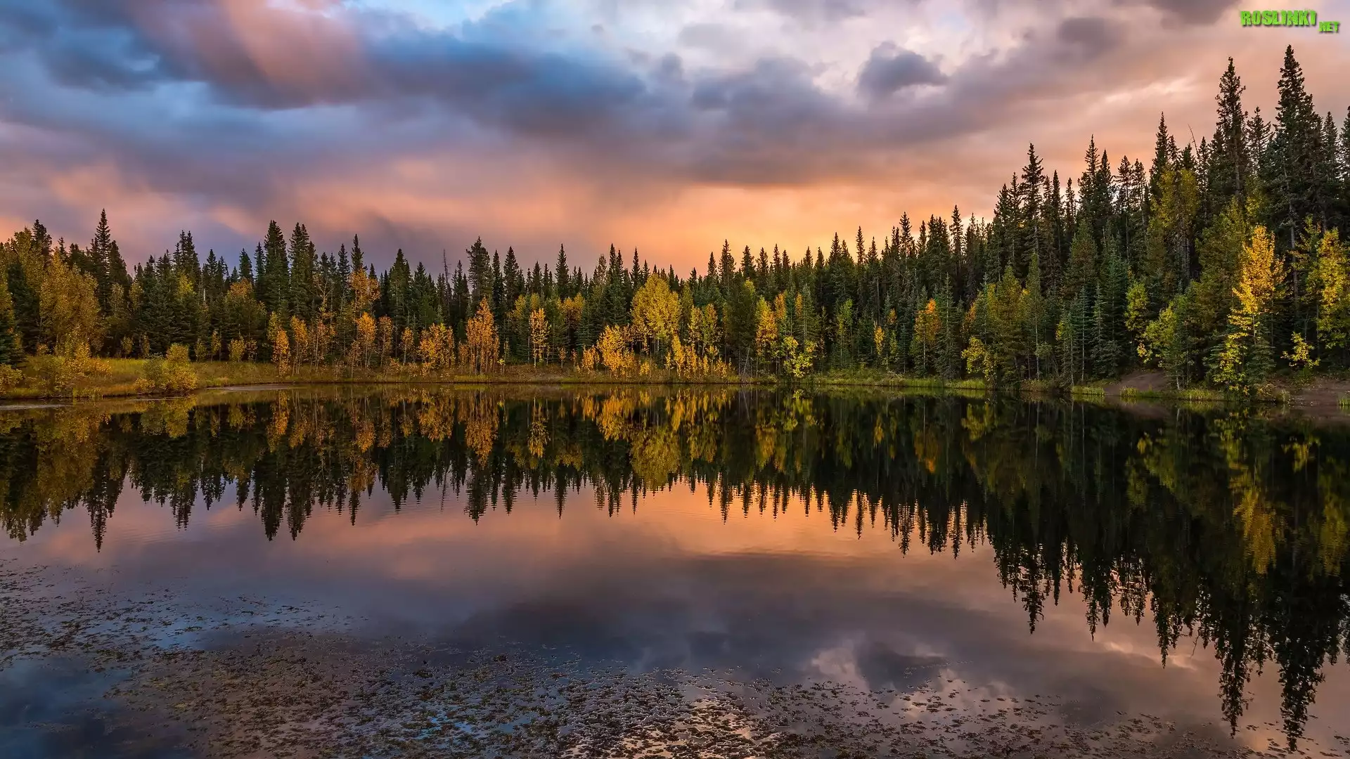 Rośliny: Jesień, Jezioro, Las, Drzewa, Odbicie, Chmury