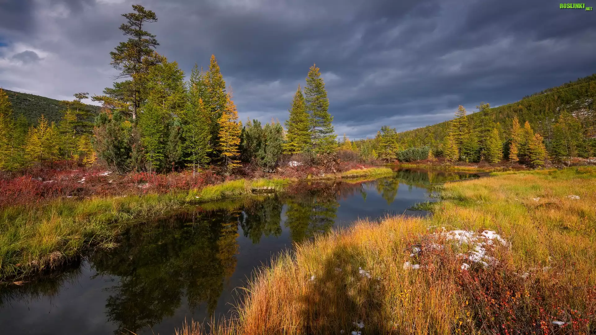 Rośliny: Rosja, Kołyma, Rzeka, Drzewa, Jesień, Chmury