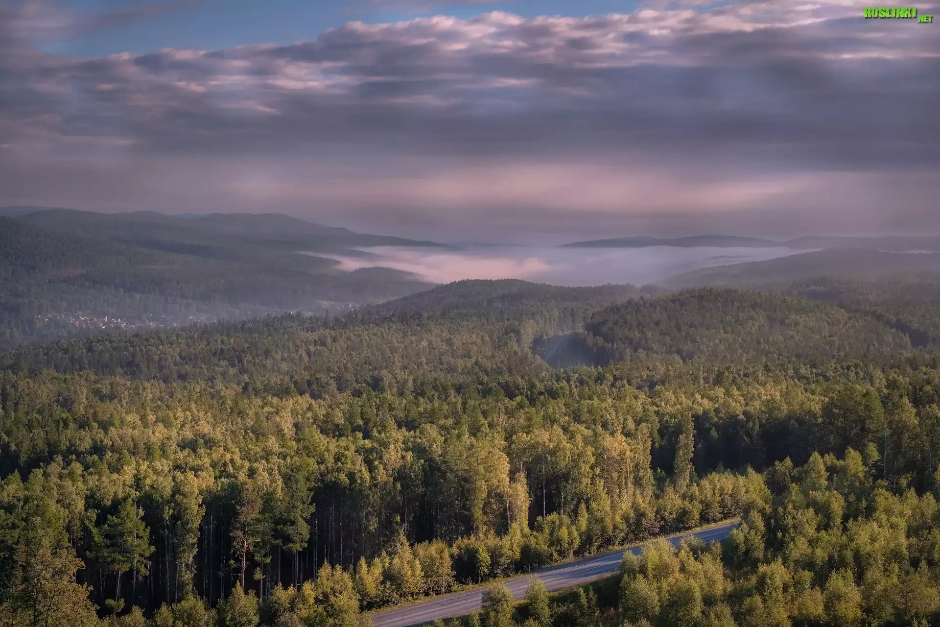 Rośliny: Drzewa, Lasy, Wzgórza, Droga, Chmury, Mgła