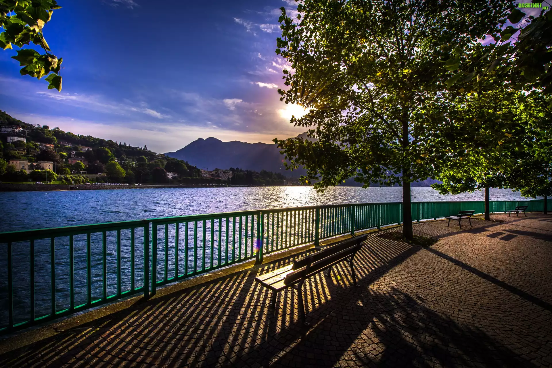 Rośliny: Włochy, Jezioro Como, Ławka, Wschód słońca, Góry, Bulwar, Drzewa