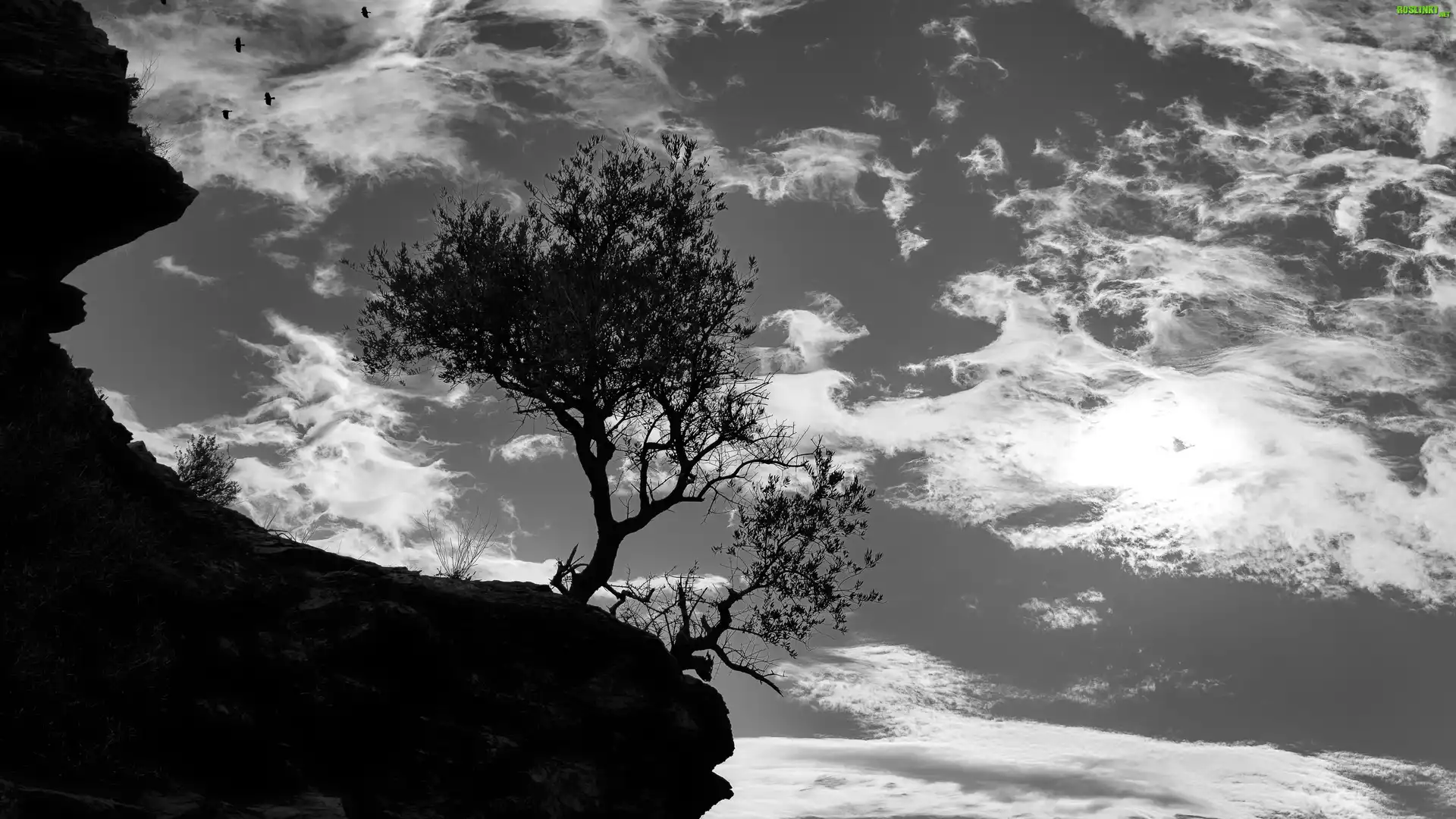 Drzewa, Ptaki, Urwisko, Chmury, Czarno-białe