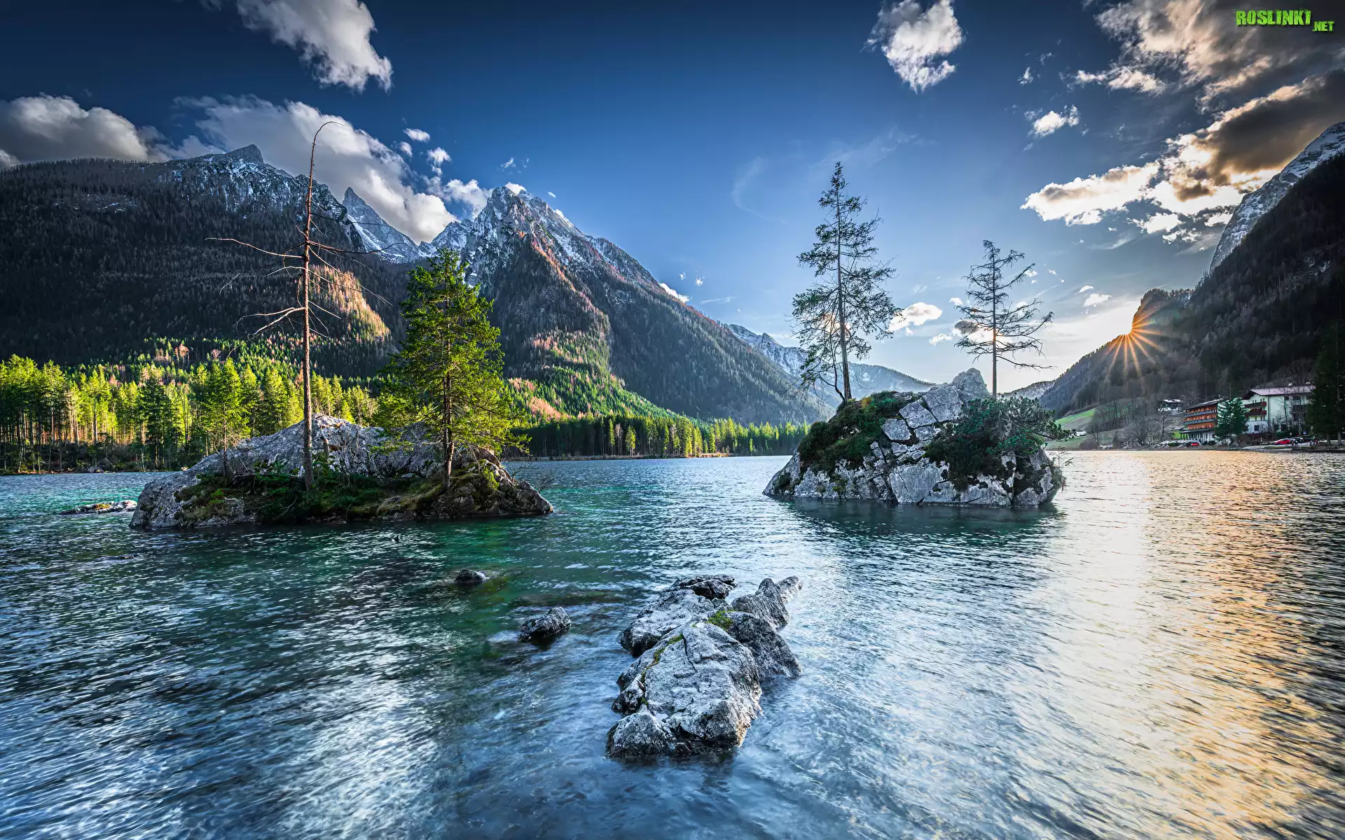 Rośliny: Niemcy, Bawaria, Góry, Jezioro Hintersee, Wysepki, Drzewa, Dom, Promienie słońca, Chmury