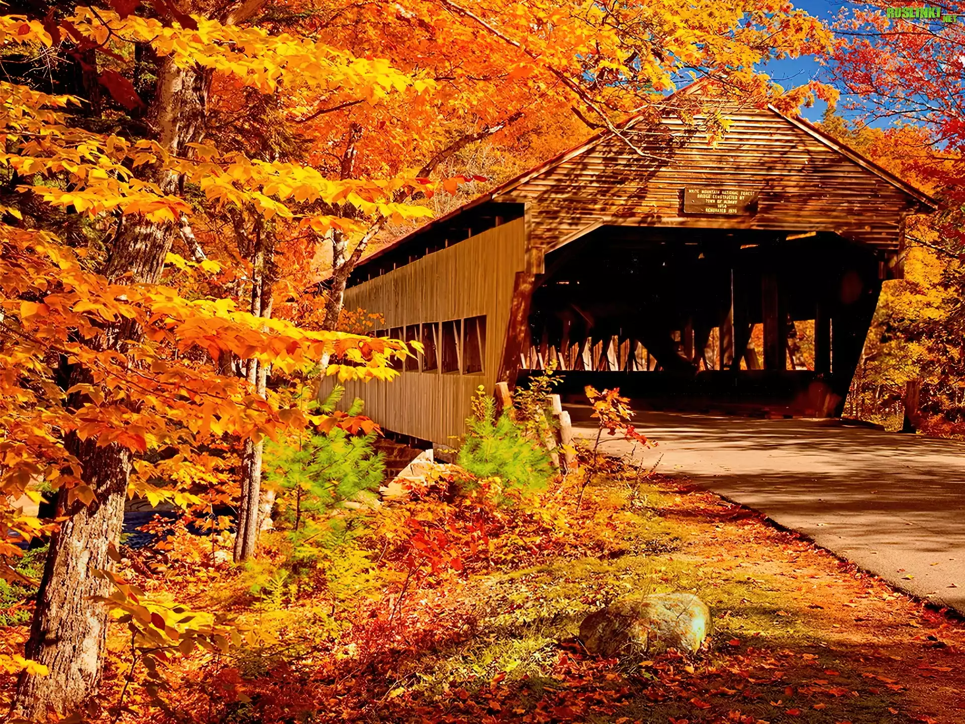 Rośliny: Drzewa, Liście, Jesień, Drewniany, Most