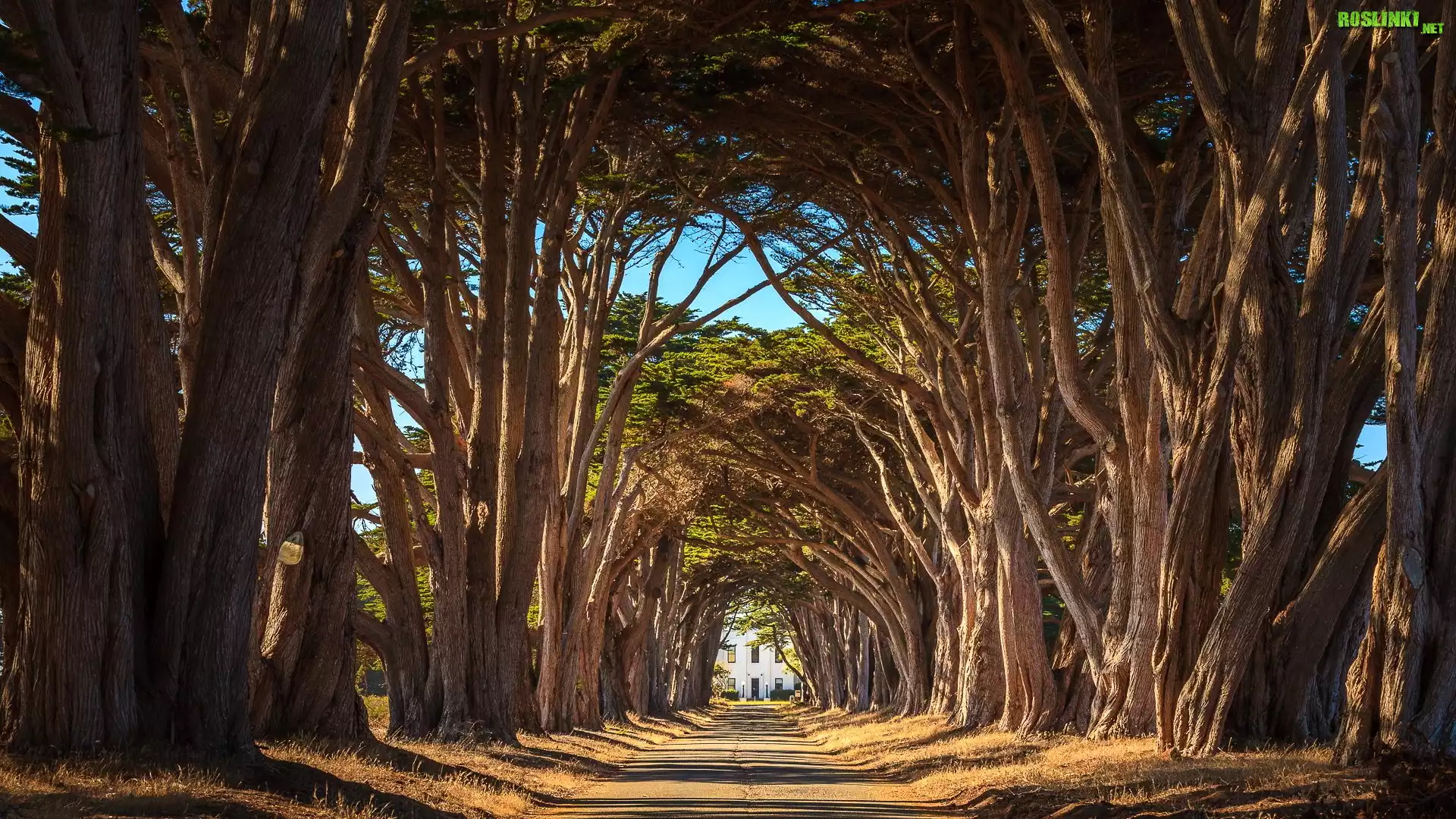 Drzewa, Cyprysy, Aleja, Droga, Park Narodowy Point Reyes National Seashore, Kalifornia, Stany Zjednoczone |