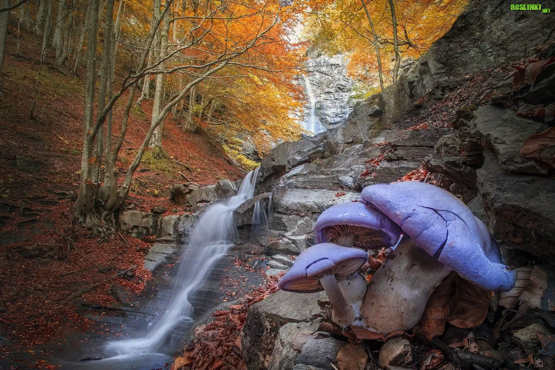 Rośliny: Jesień, Drzewa, Las, Skały, Wodospad, Kaskada, Grzyby, Fotomontaż