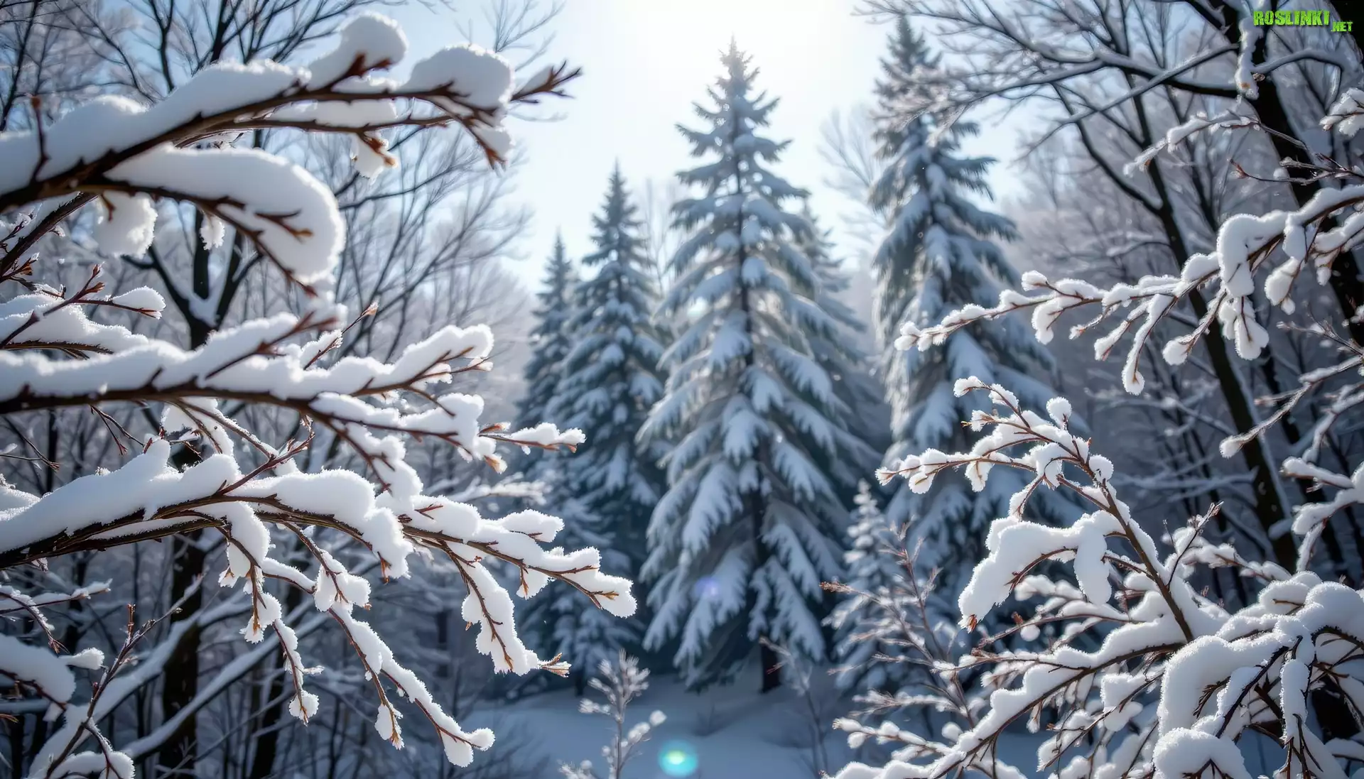 Rośliny: Zima, Ośnieżone, Gałązki, Drzewa, Las, Grafika AI