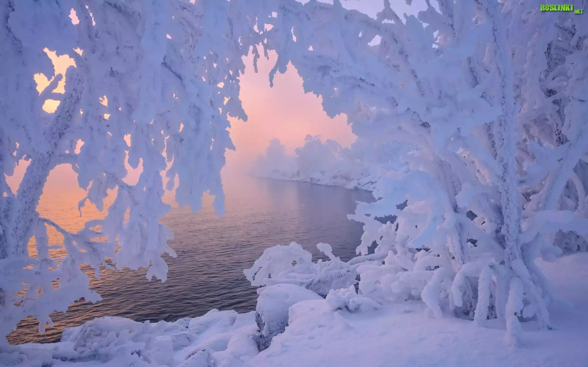 Rośliny: Zima, Drzewa, Gałęzie, Ośnieżone, Jezioro