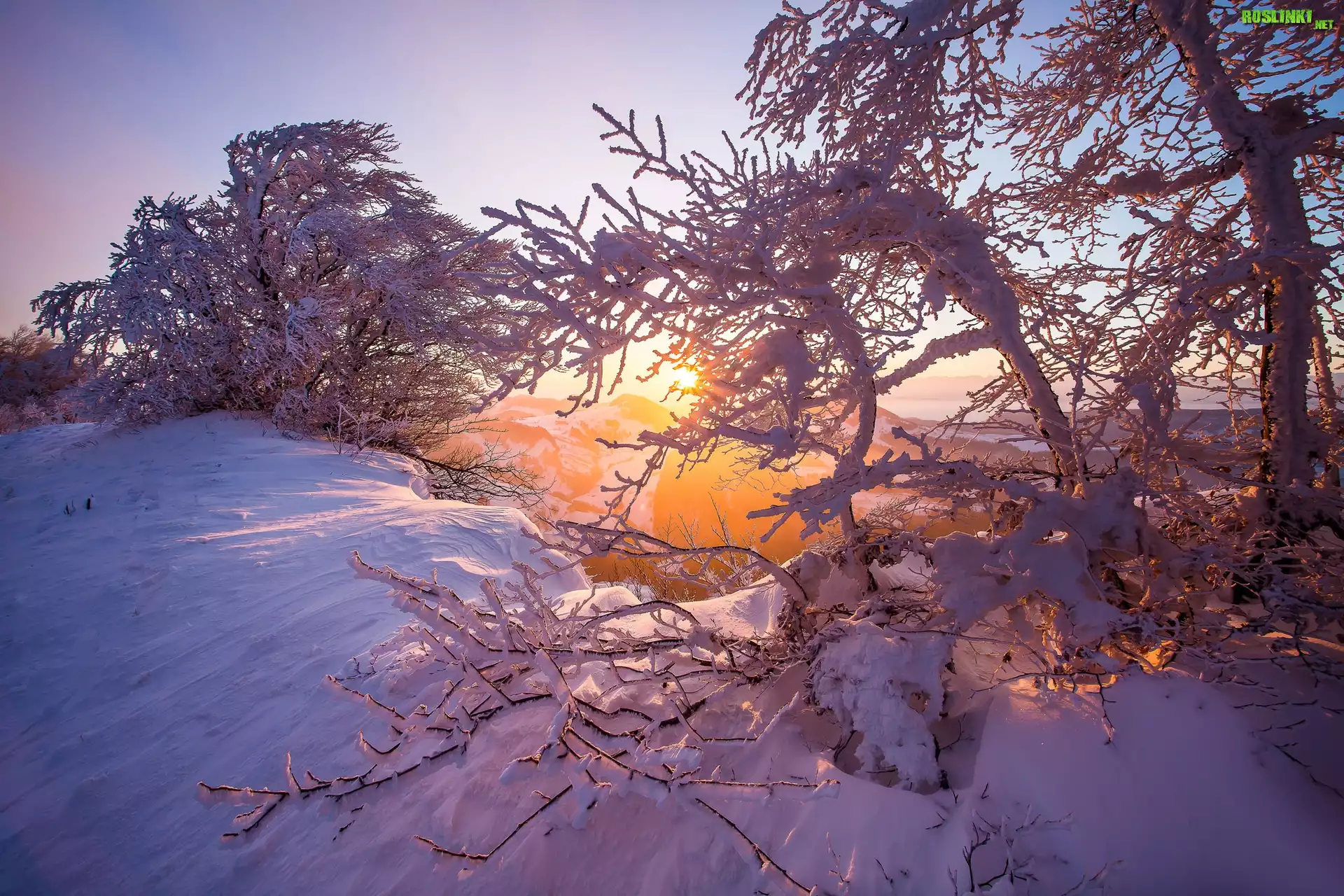 Rośliny: Szwajcaria, Alpy, Góry Jura, Zima, Wschód słońca, Ośnieżone, Drzewa