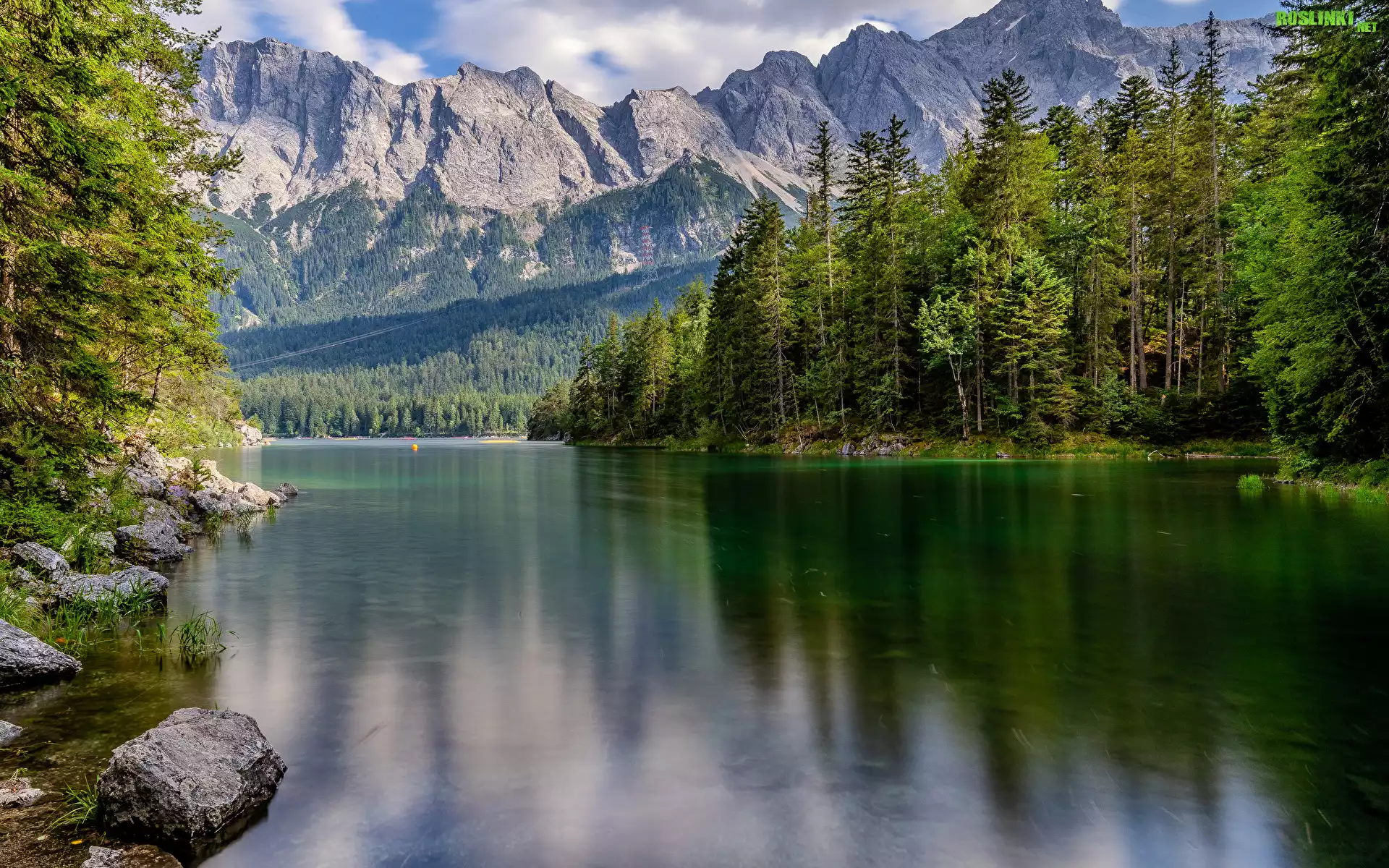 Rośliny: Niemcy, Bawaria, Góry, Alpy Bawarskie, Jezioro, Eibsee Lake, Lasy, Drzewa, Kamienie, Odbicie