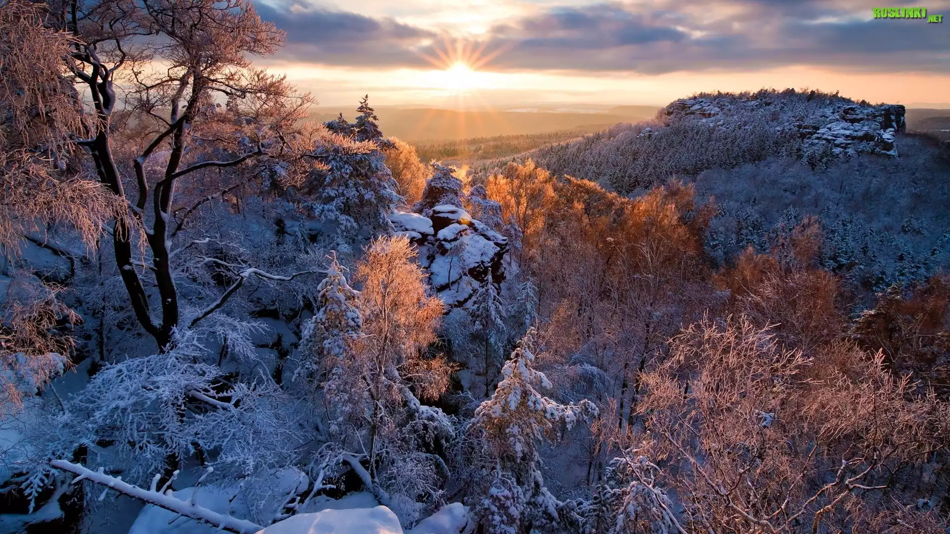 Rośliny: Góry, Drzewa, Zima, Śnieg, Promienie słońca, Skały