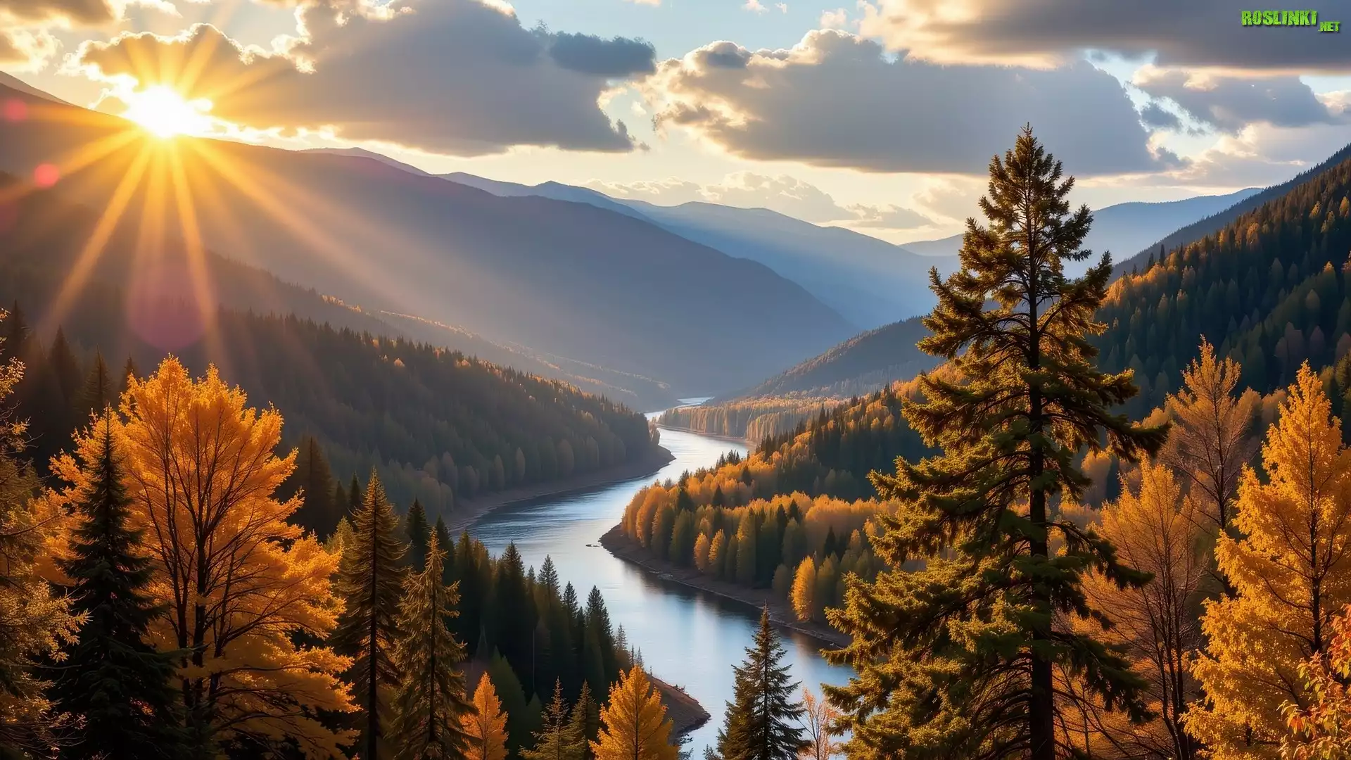 Rośliny: Jesień, Zalesione, Góry, Rzeka, Promienie słońca, Żółte, Drzewa