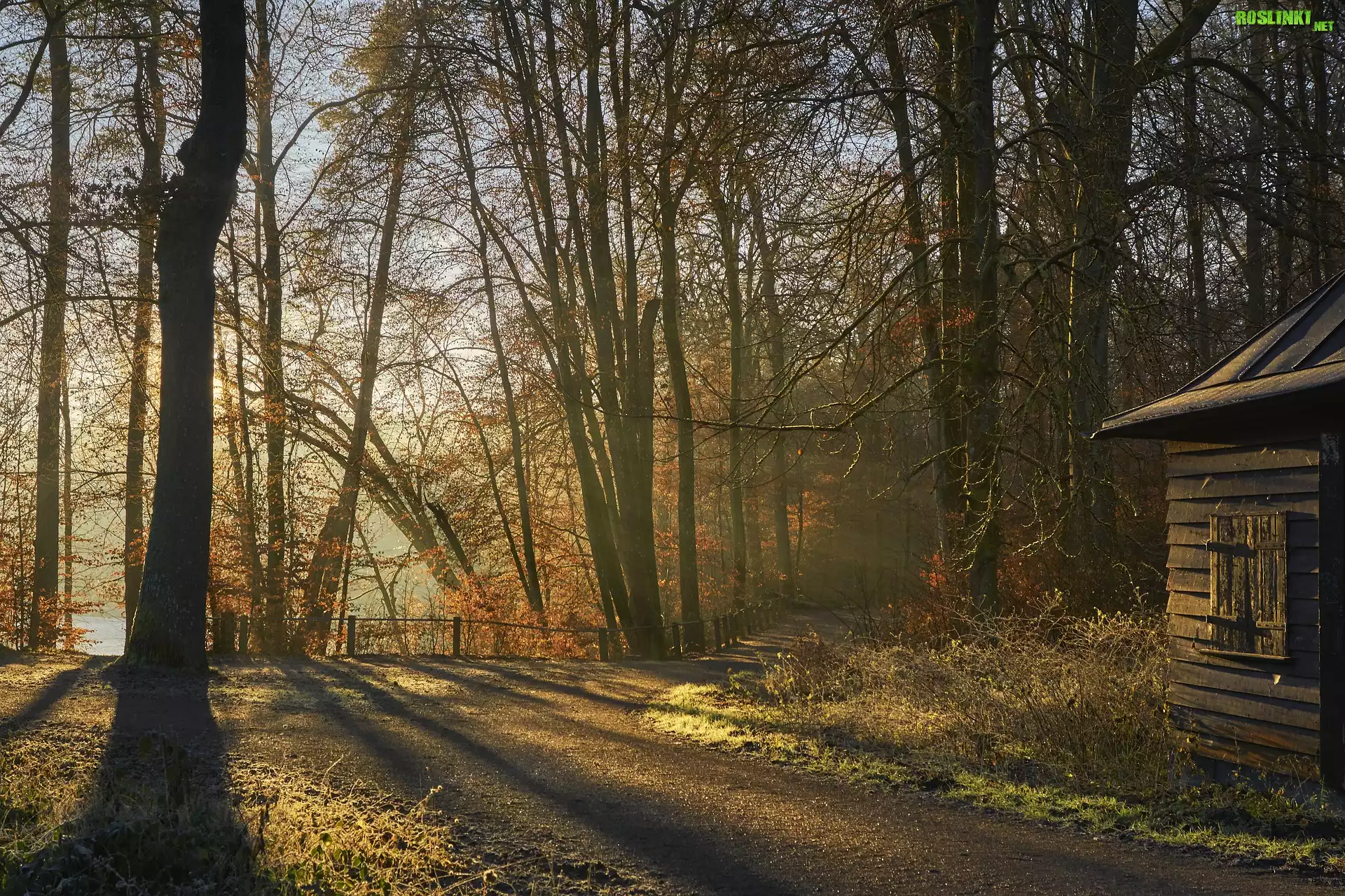 Rośliny: Jesień, Drzewa, Las, Droga, Szopa, Słoneczny blask