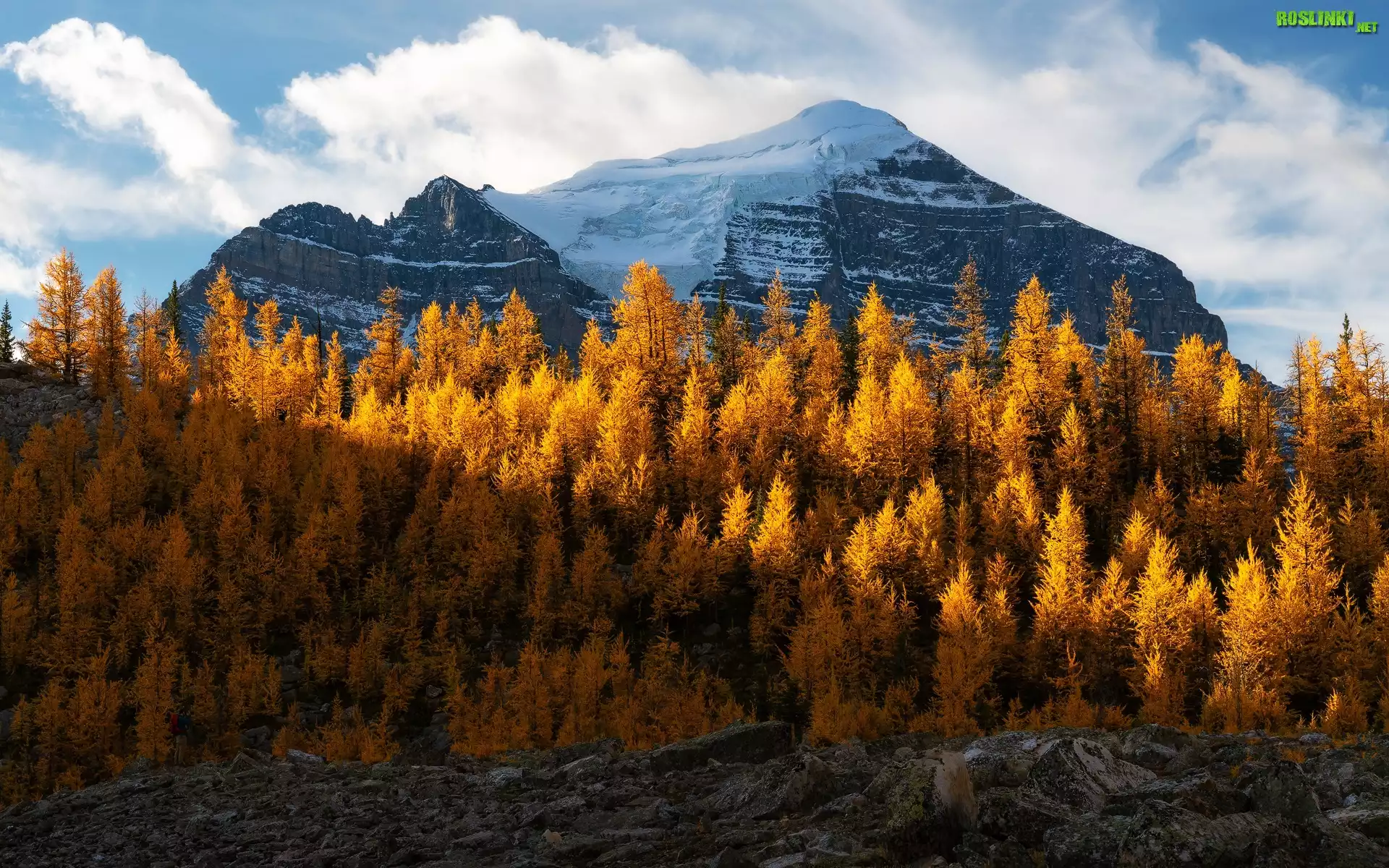 Rośliny: Góry, Drzewa, Jesień, Kamienie, Chmury