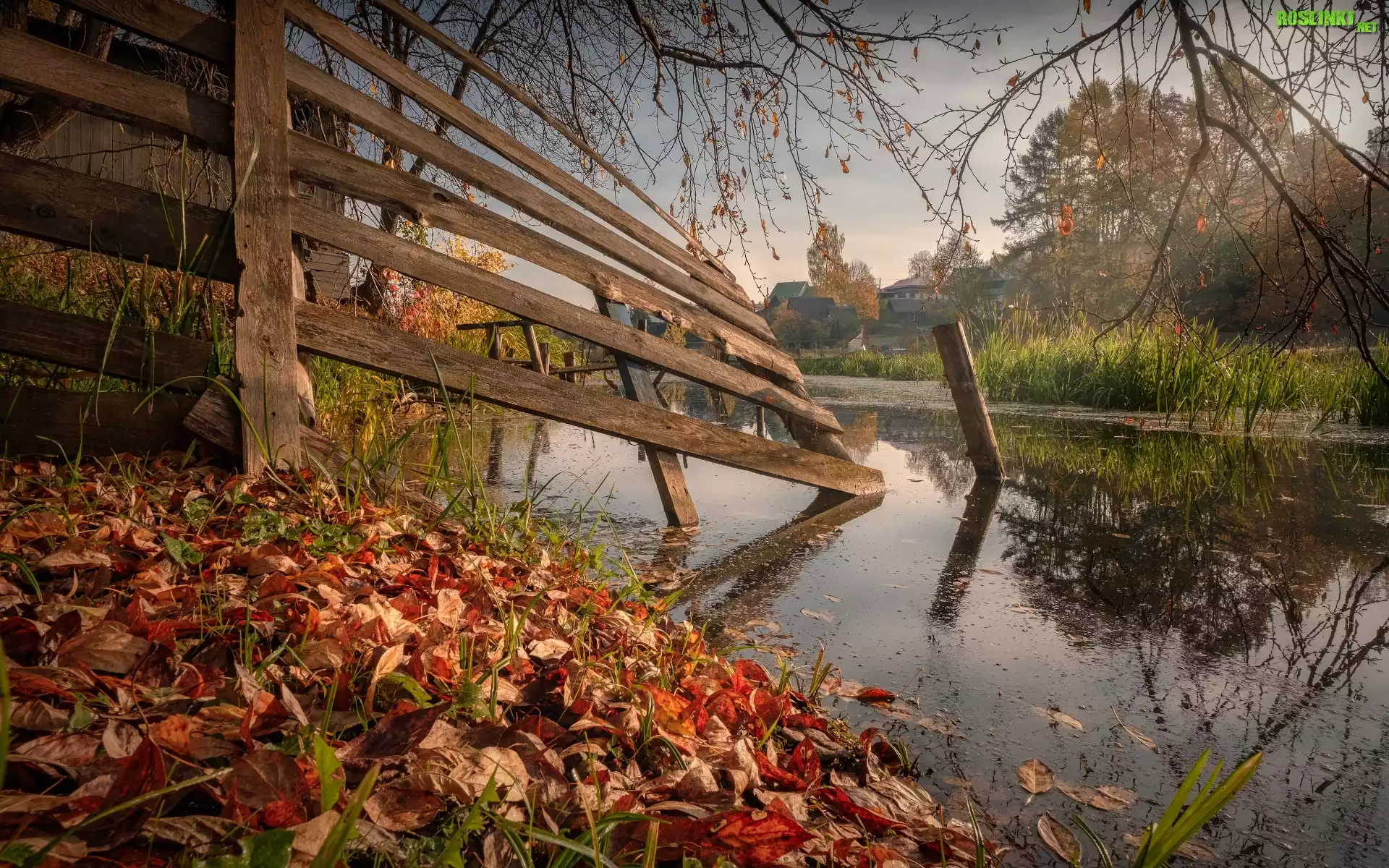 Rośliny: Jesień, Drzewa, Ogrodzenie, Płot, Staw, Liście, Domy