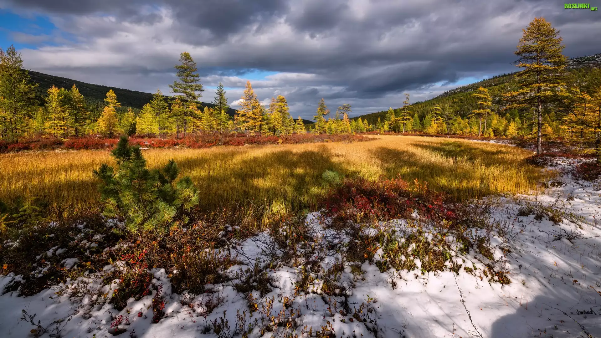 Rosja, Kołyma, Jesień, Drzewa, Łąka, Śnieg, Chmury