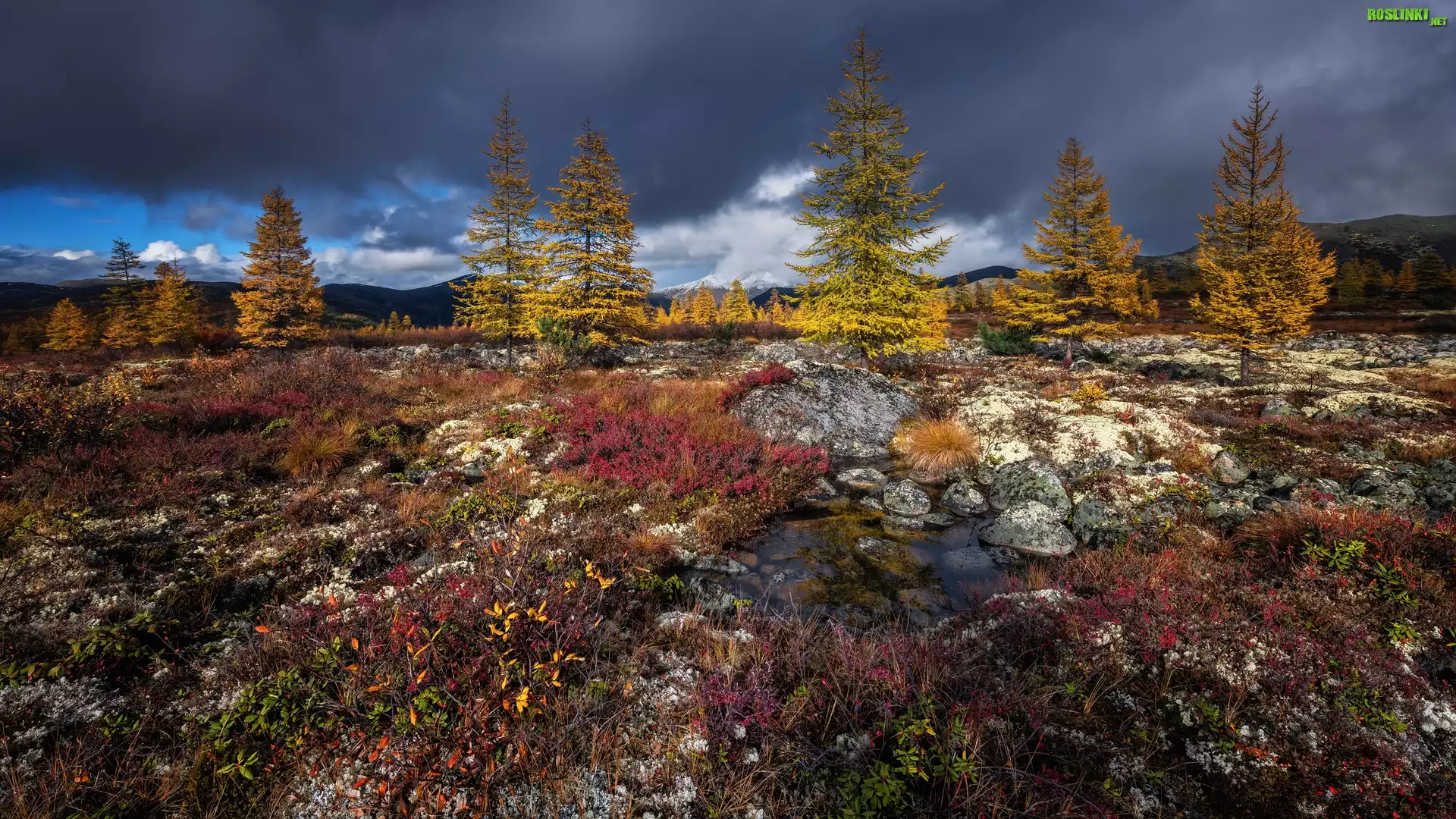 Rośliny: Rosja, Kołyma, Jesień, Drzewa, Łąka, Zachmurzone, Niebo