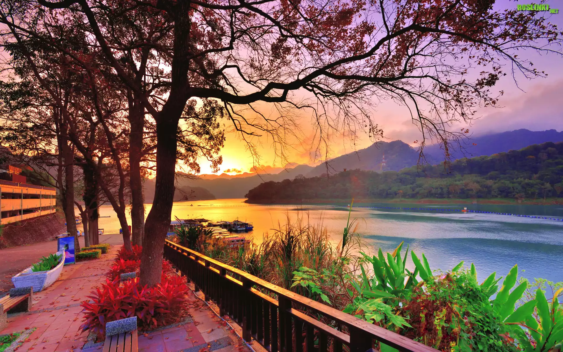 Rośliny: Jesień, Drzewa, Ławki, Rośliny, Góry, Rzeka, Poranek