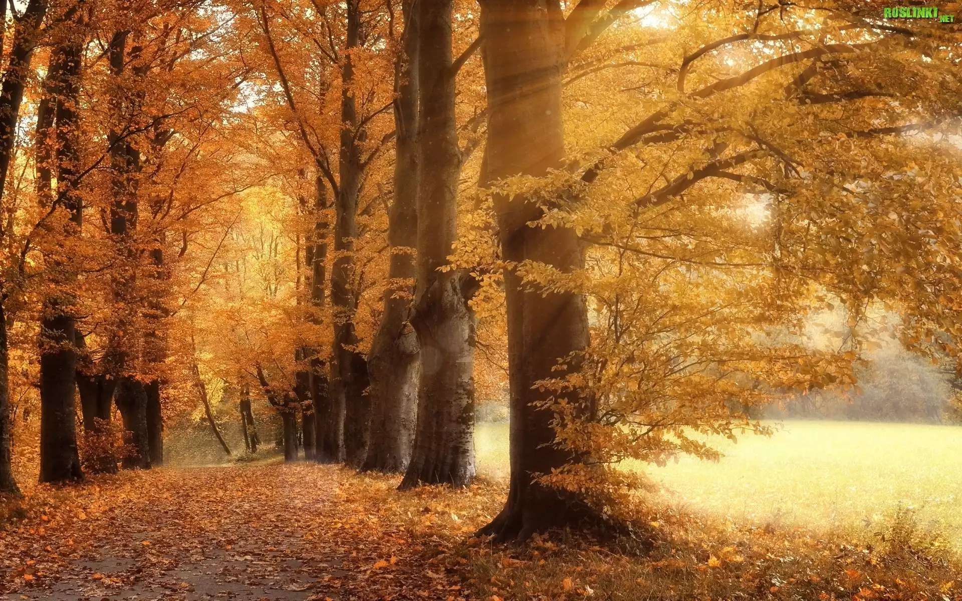 Rośliny: Jesień, Drzewa, Droga, Pożółkłe, Liście, Światło, Słoneczne