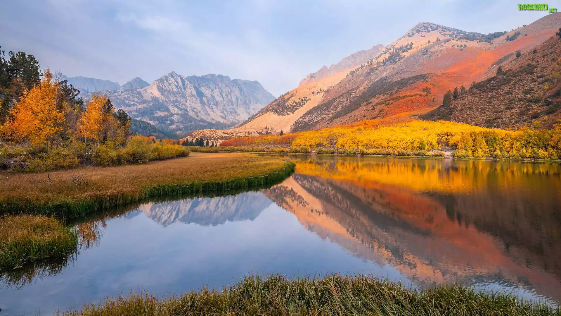 Jesień, Region, Eastern Sierra, Góry, Drzewa, Jezioro, North Lake, Kalifornia, Stany Zjednoczone