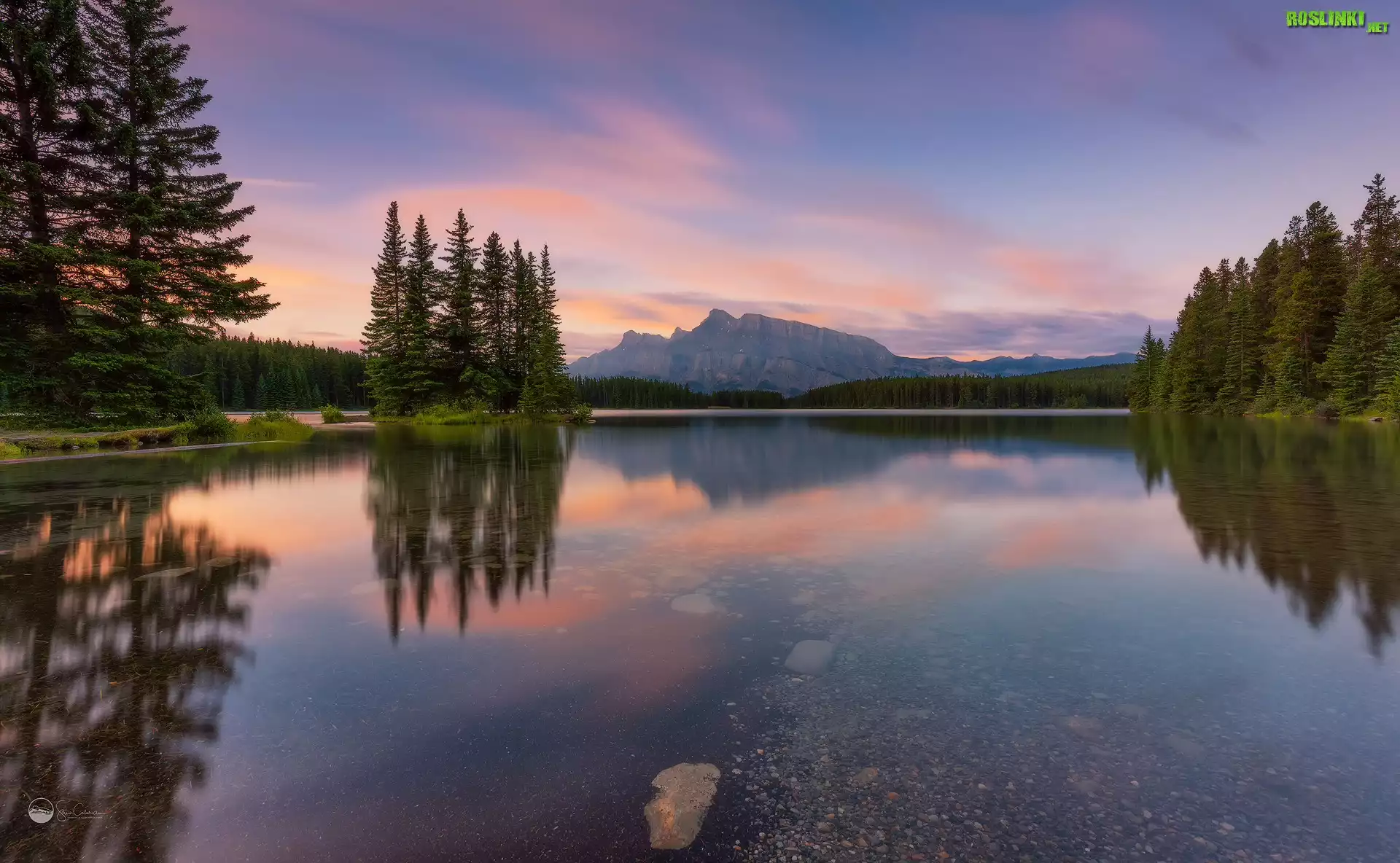 Rośliny: Góry, Góra, Mount Rundle, Jezioro, Two Jack Lake, Drzewa, Park Narodowy Banff, Alberta, Kanada