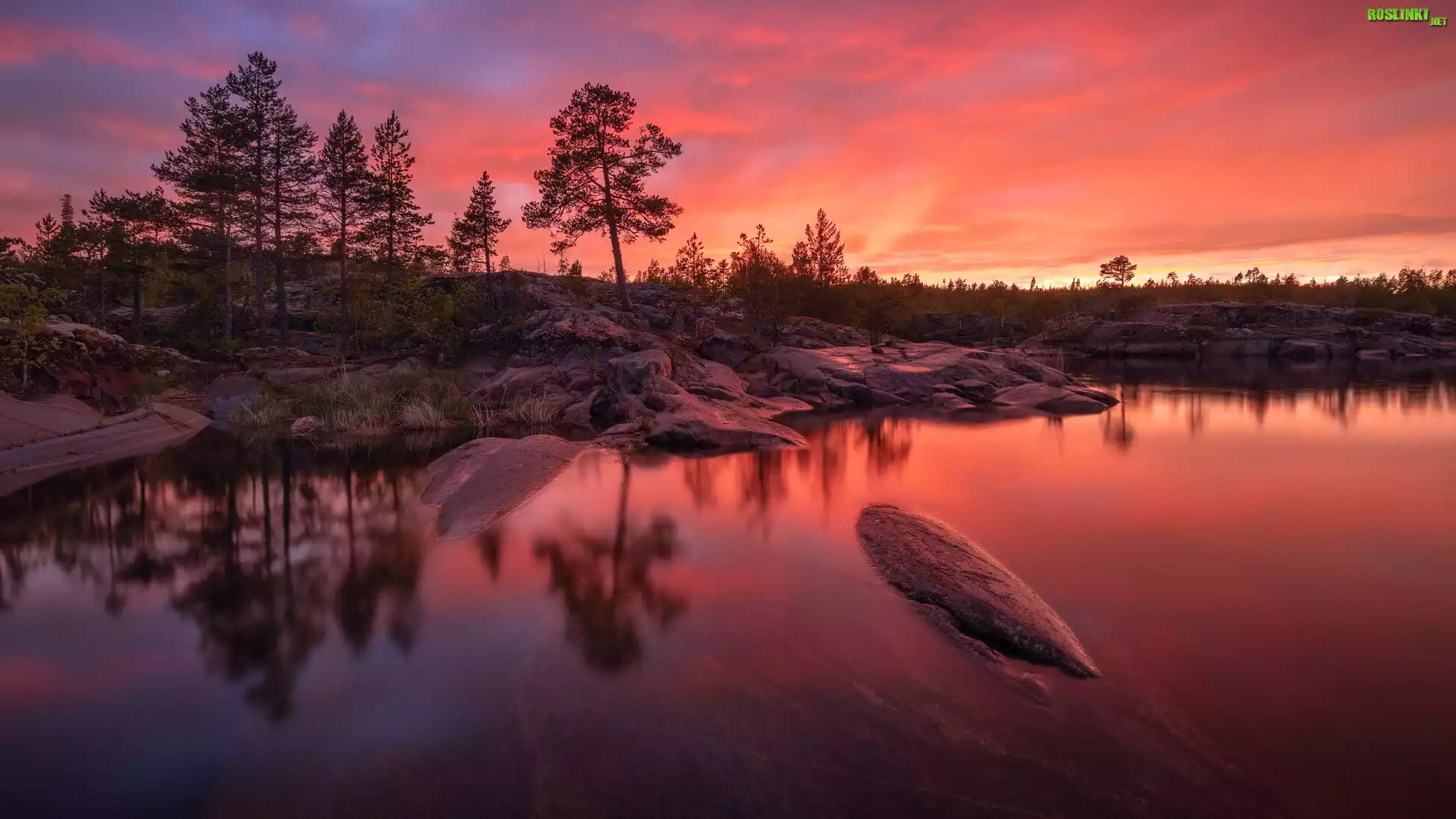 Rośliny: Rosja, Karelia, Jezioro, Ładoga, Zachód słońca, Skały, Drzewa