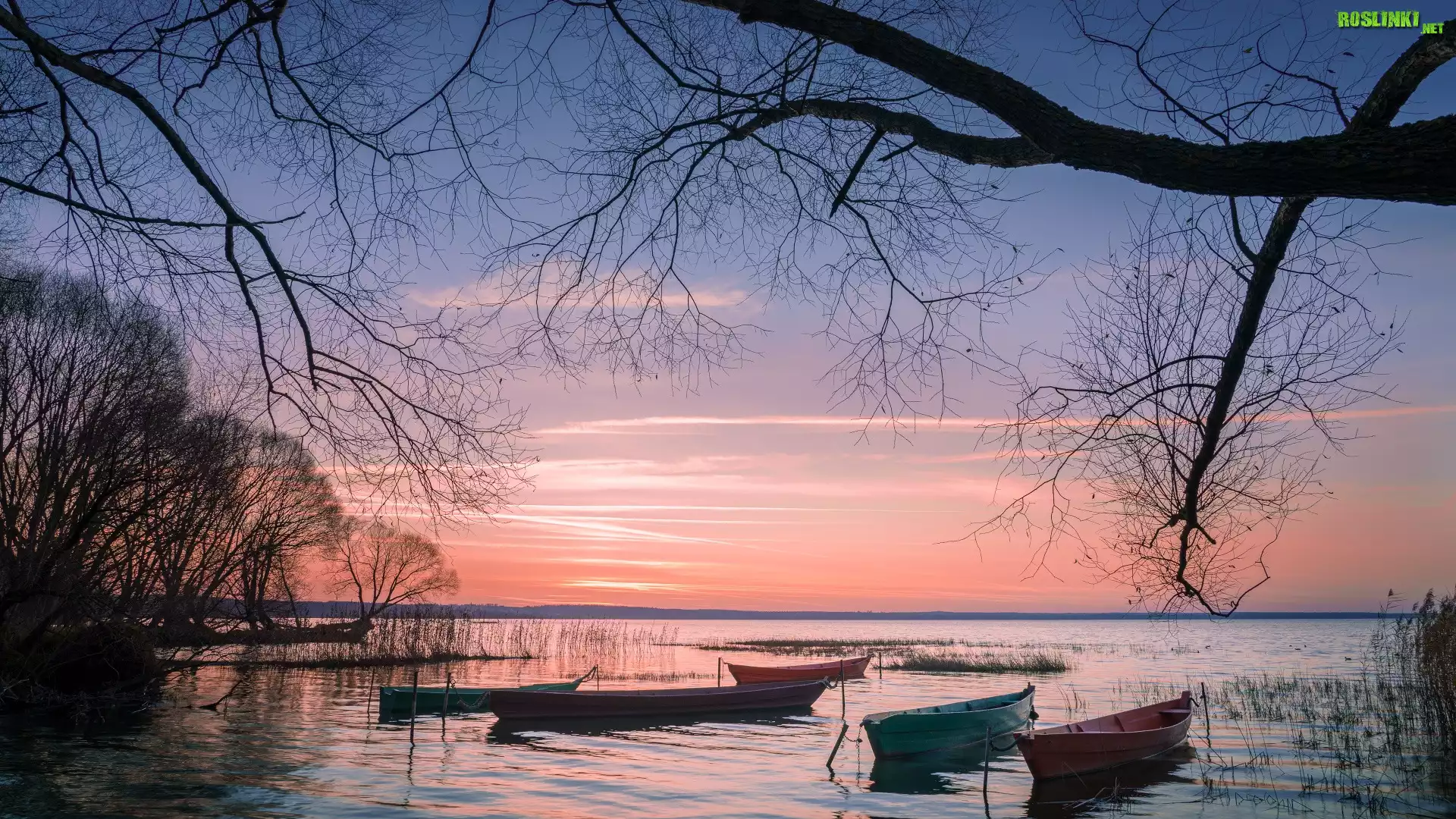 Rośliny: Zachód słońca, Łódki, Drzewa, Gałęzie, Jezioro