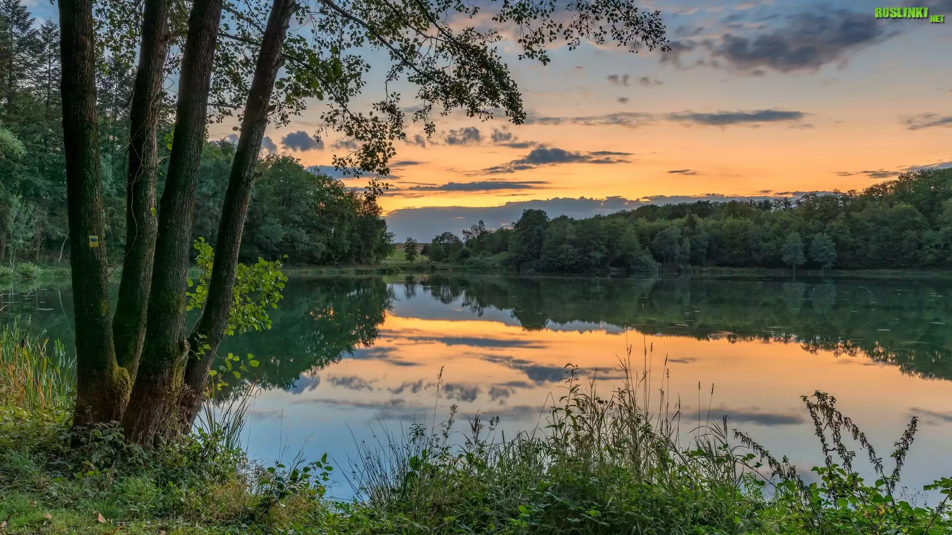 Rośliny: Jezioro, Drzewa, Trawa, Zachód słońca, Chmury, Odbicie