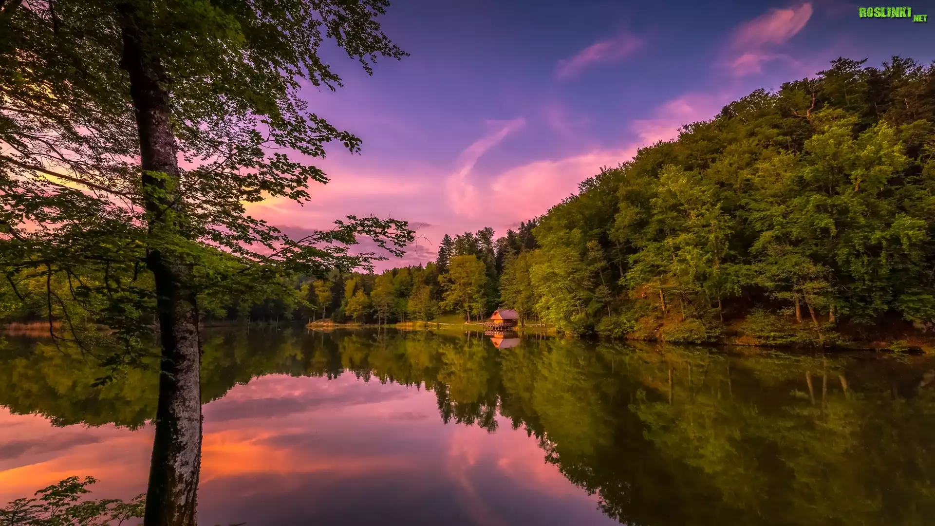 Rośliny: Jezioro, Drzewa, Las, Domek, Zachód słońca, Odbicie