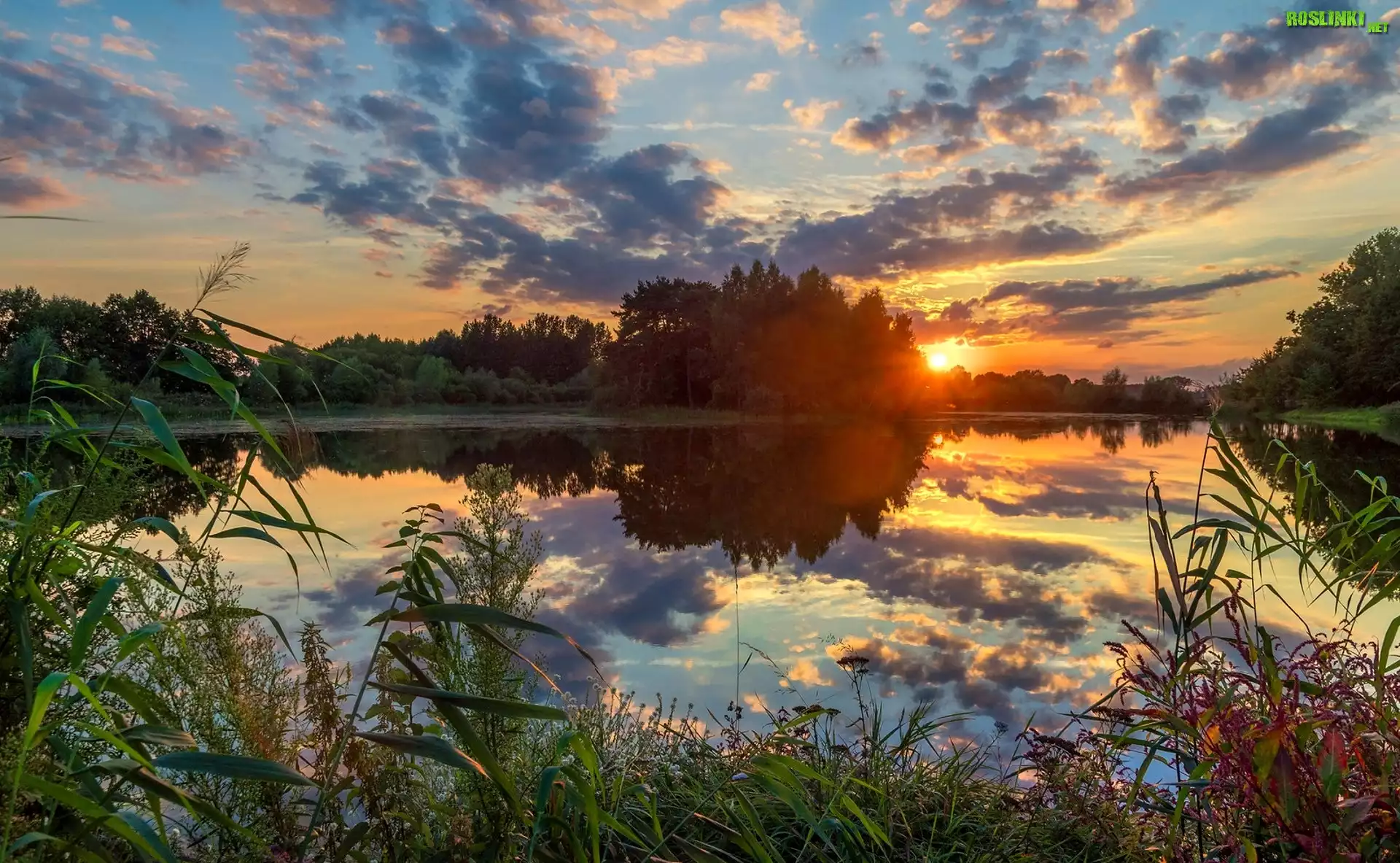 Jezioro, Drzewa, Chmury, Rośliny, Zachód słońca, Odbicie