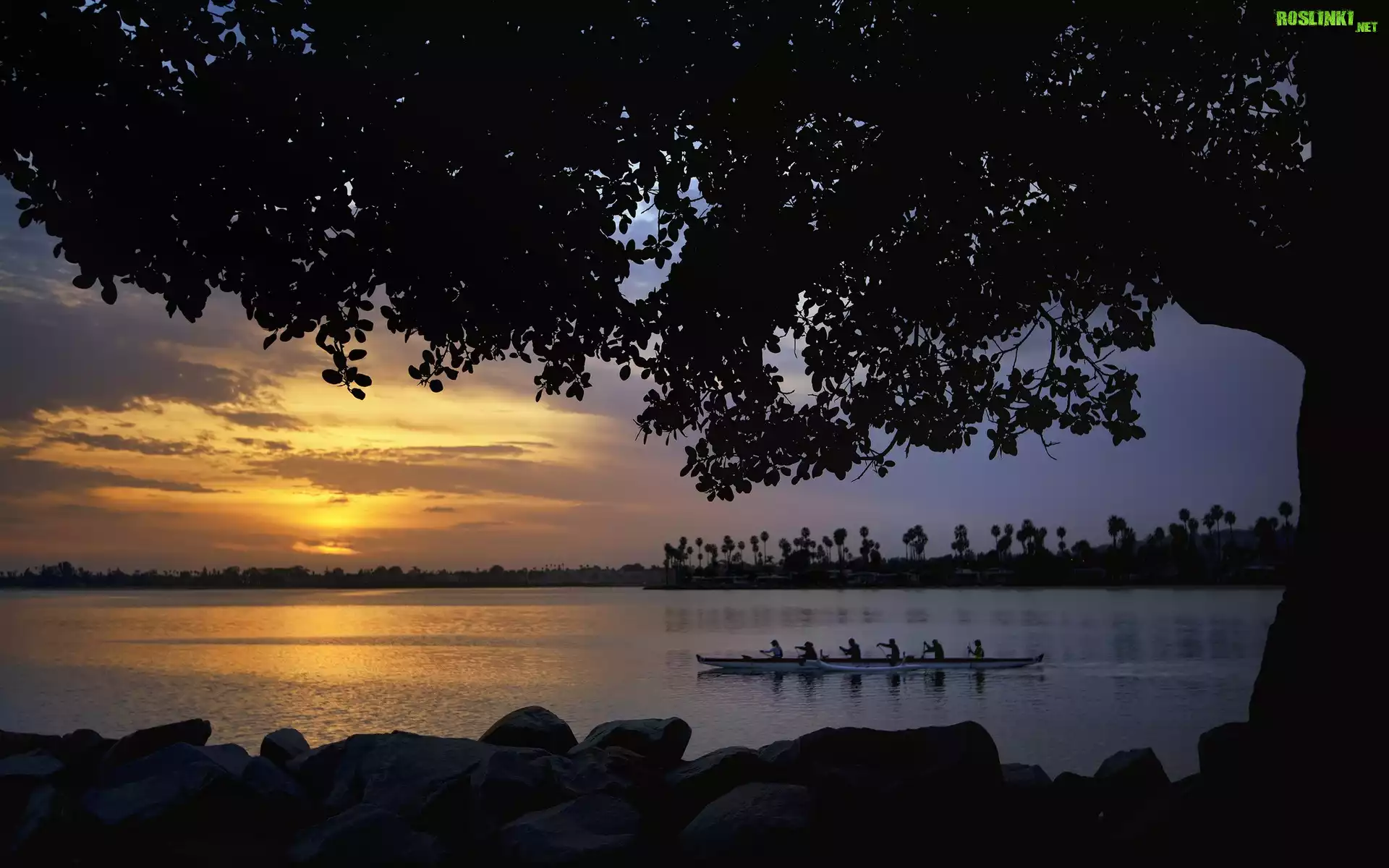 Rośliny: Jezioro, Drzewa, Kamienie, Łodzie, Ludzie, Zachód, Słońca