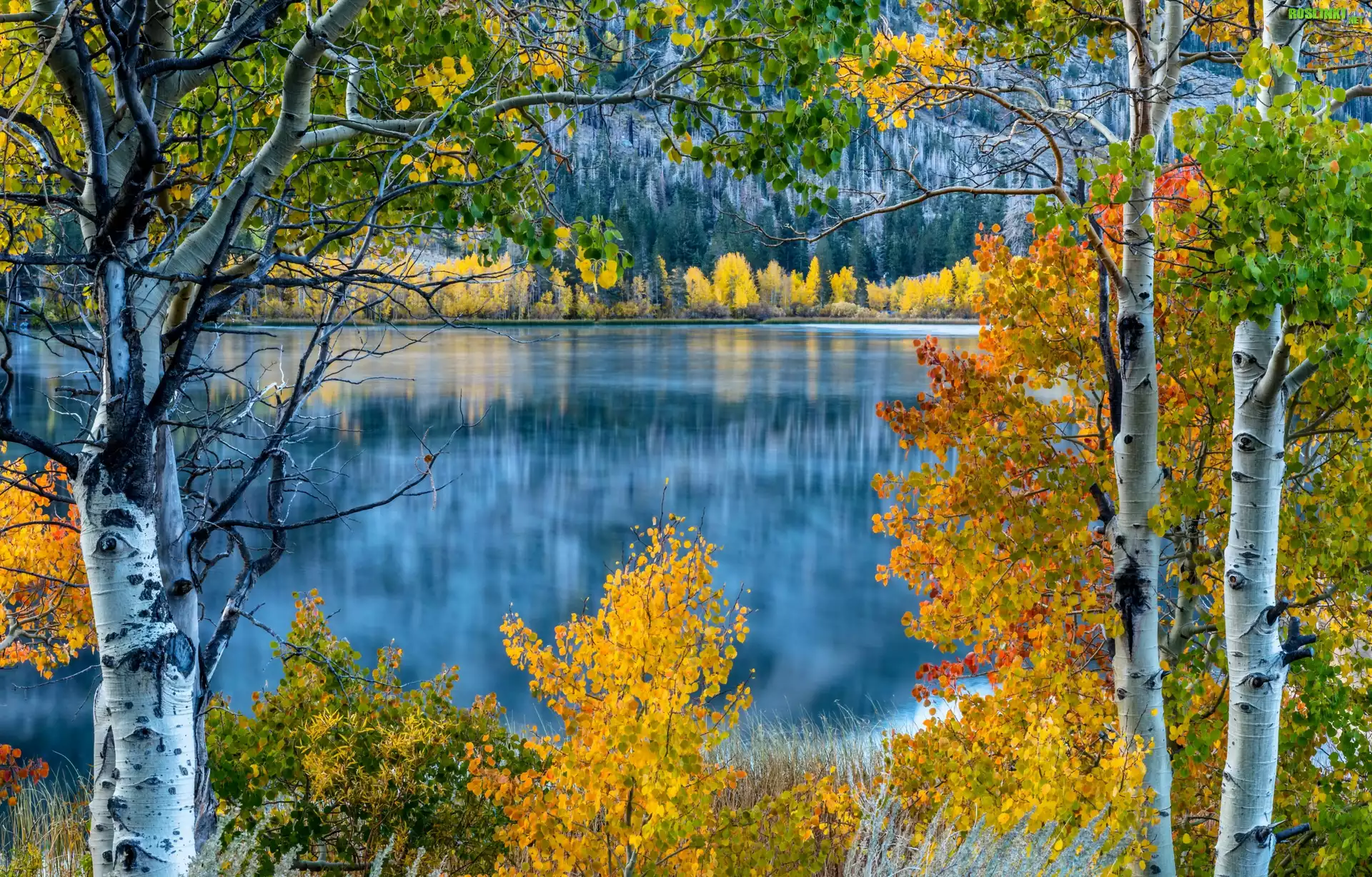 Stany Zjednoczone, Kalifornia, Jezioro June Lake, Topole osikowe, Jesień, Drzewa