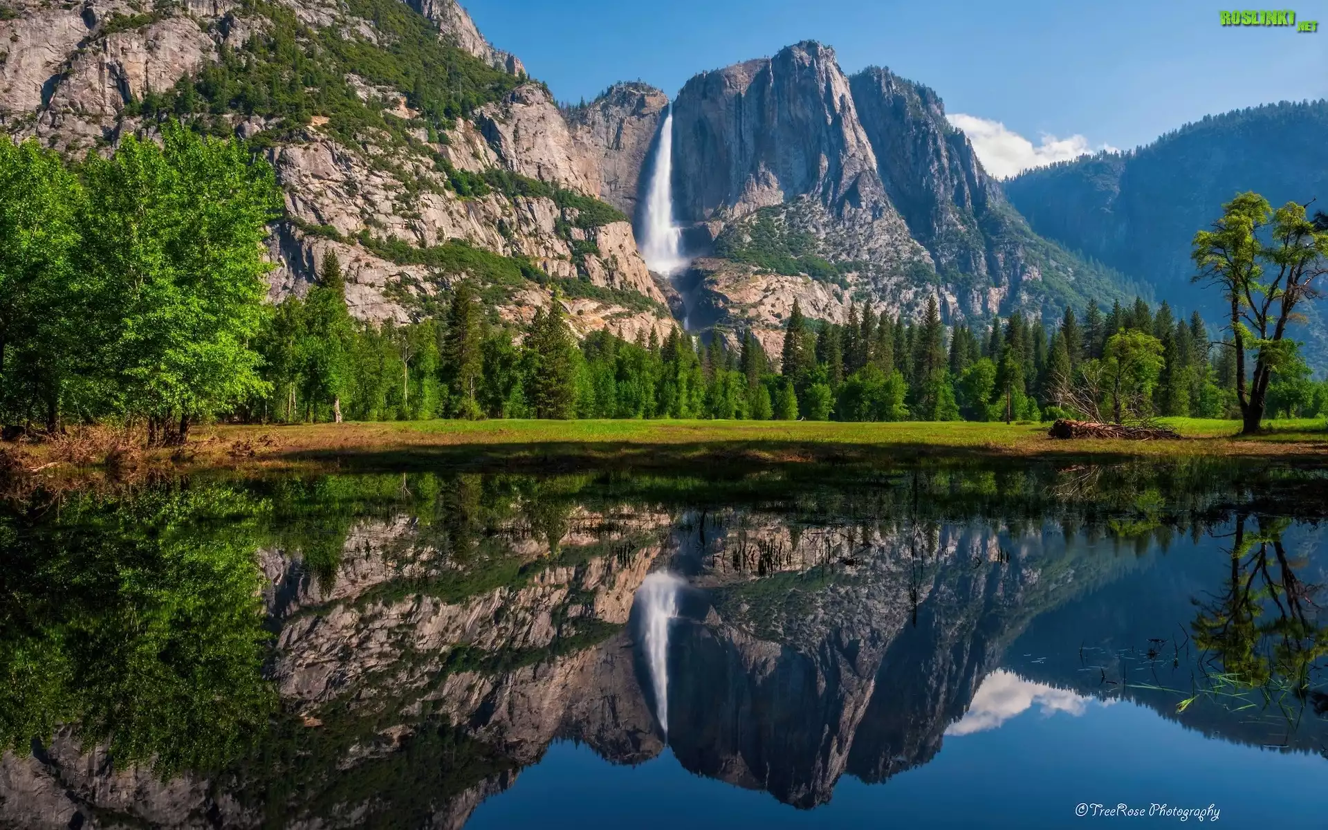 Stany Zjednoczone, Kalifornia, Park Narodowy Yosemite, Góry, Skały, Wodospad, Drzewa, Rzeka, Odbicie |
