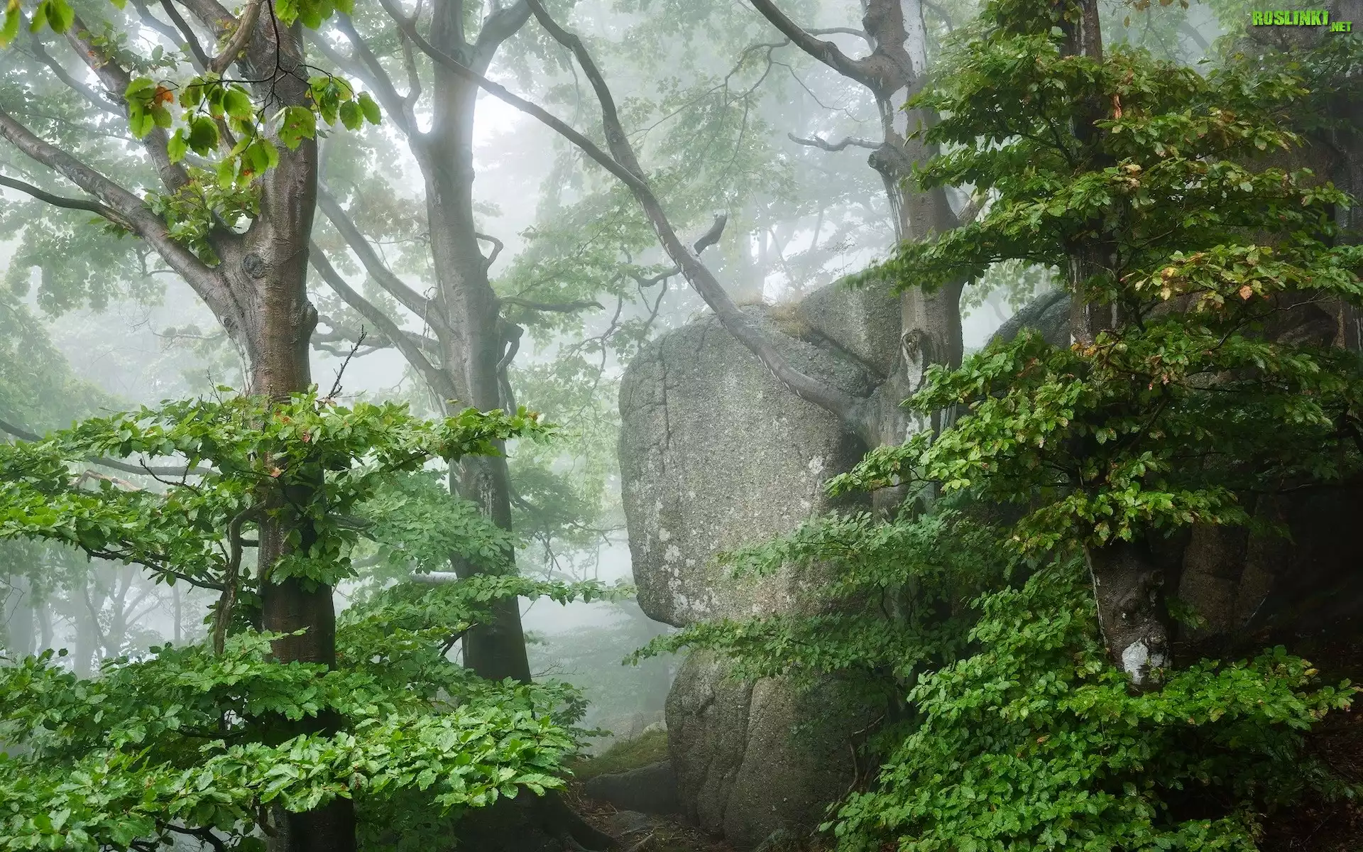 Rośliny: Las, Drzewa, Kamień, Skała, Mgła