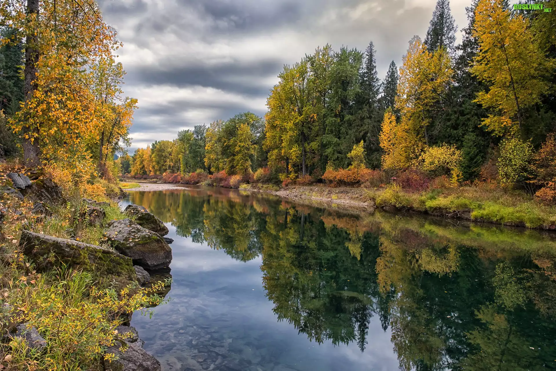 Rośliny: Jesień, Pożółkłe, Liście, Drzewa, Rzeka, Kamienie