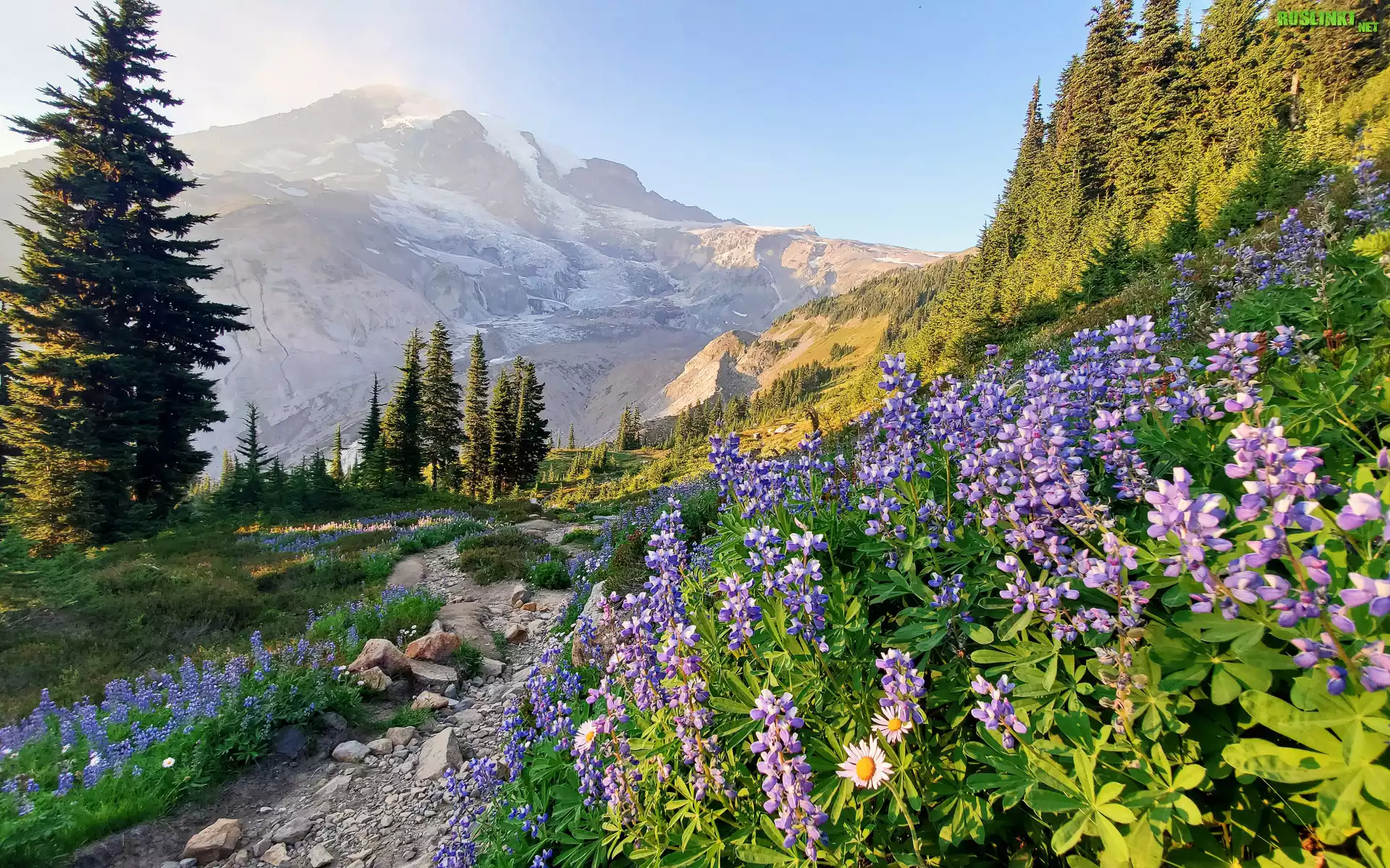 Drzewa, Kwiaty, Łubin, Kamienie, Góry, Park Narodowy Mount Rainier, Stan Waszyngton, Stany Zjednoczone |