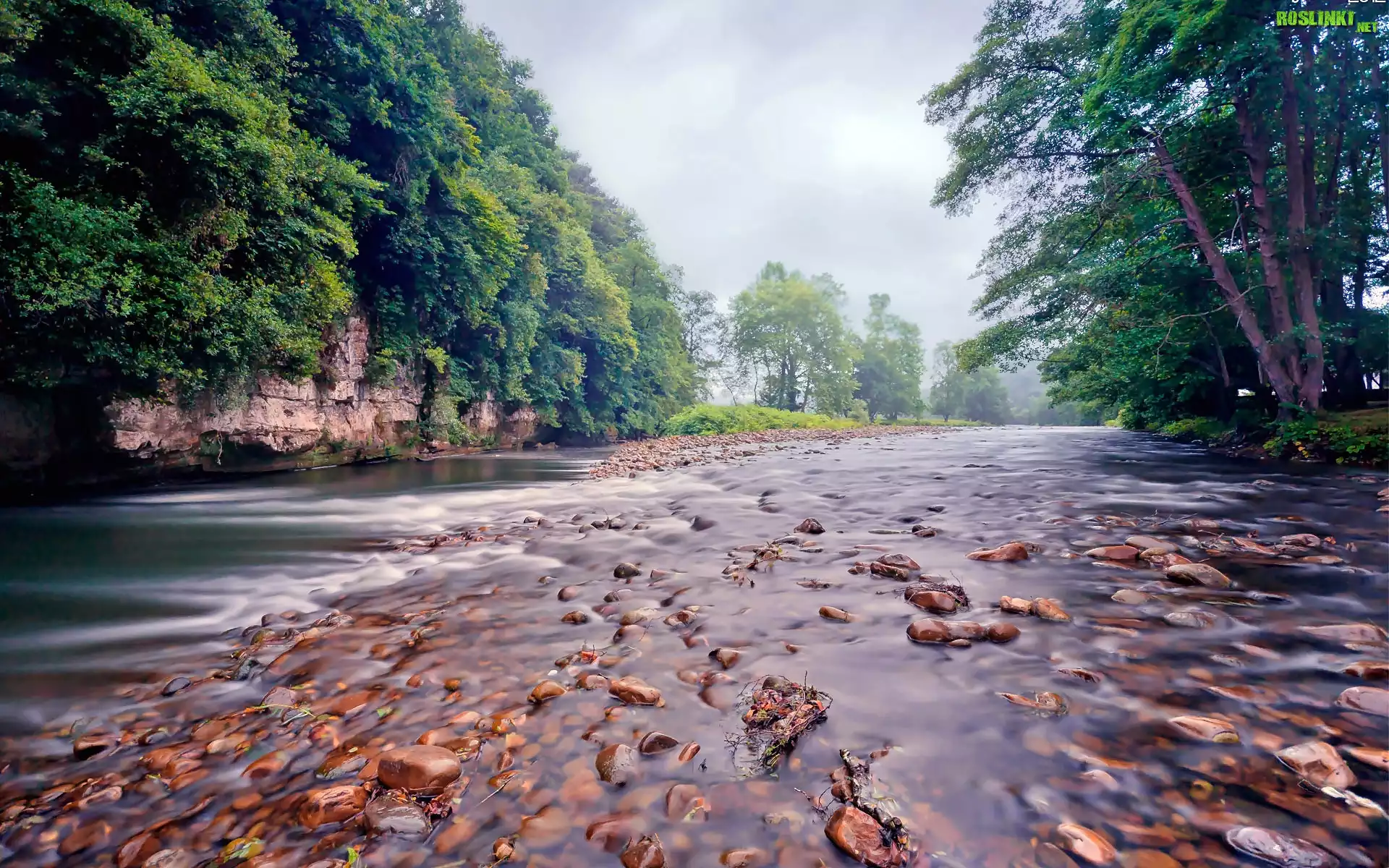 Rośliny: Drzewa, Rzeka, Kamienie, Mgła