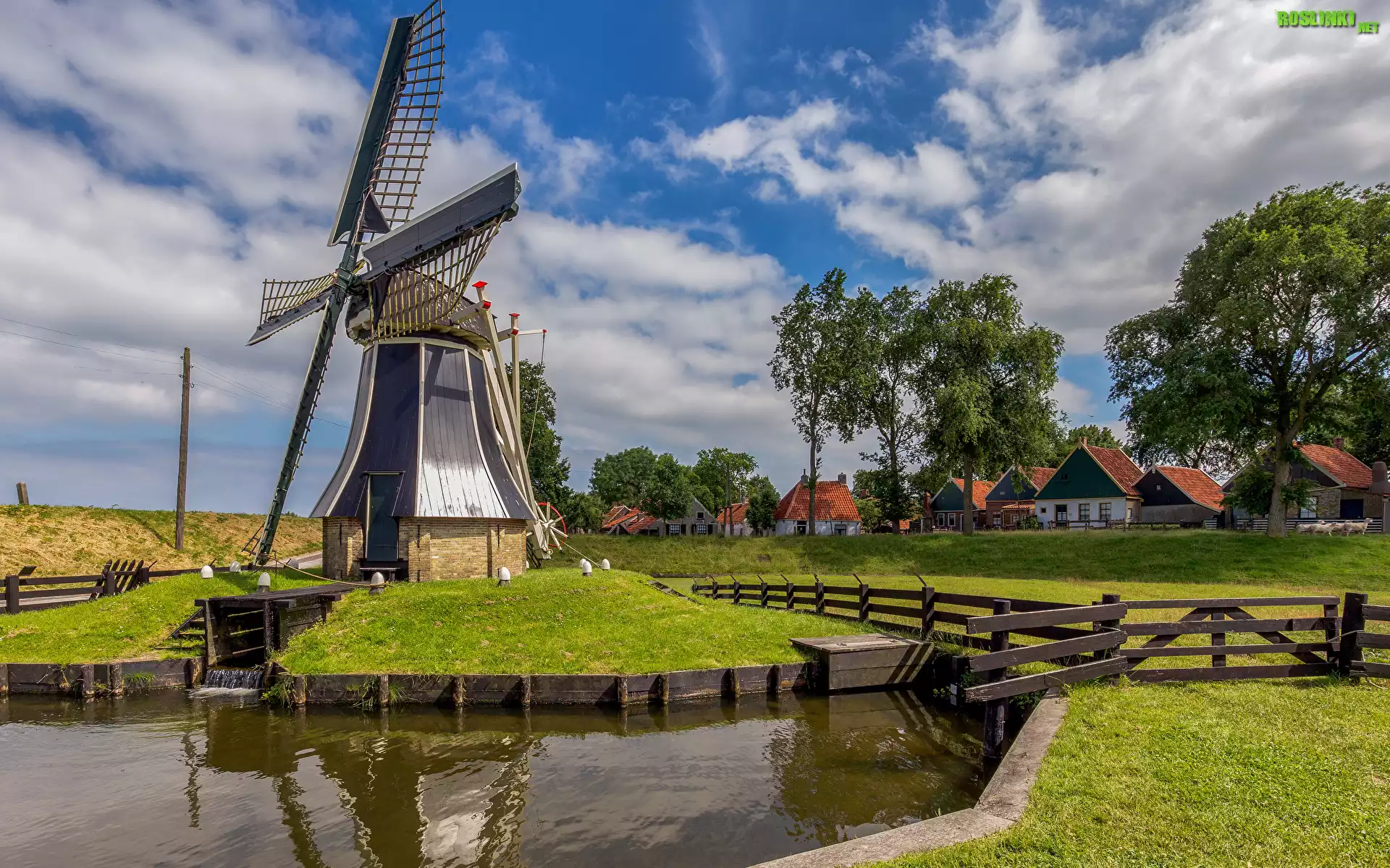 Rośliny: Holandia, Enkhuizen, Kanał wodny, Wiatrak, Płot, Domy, Drzewa