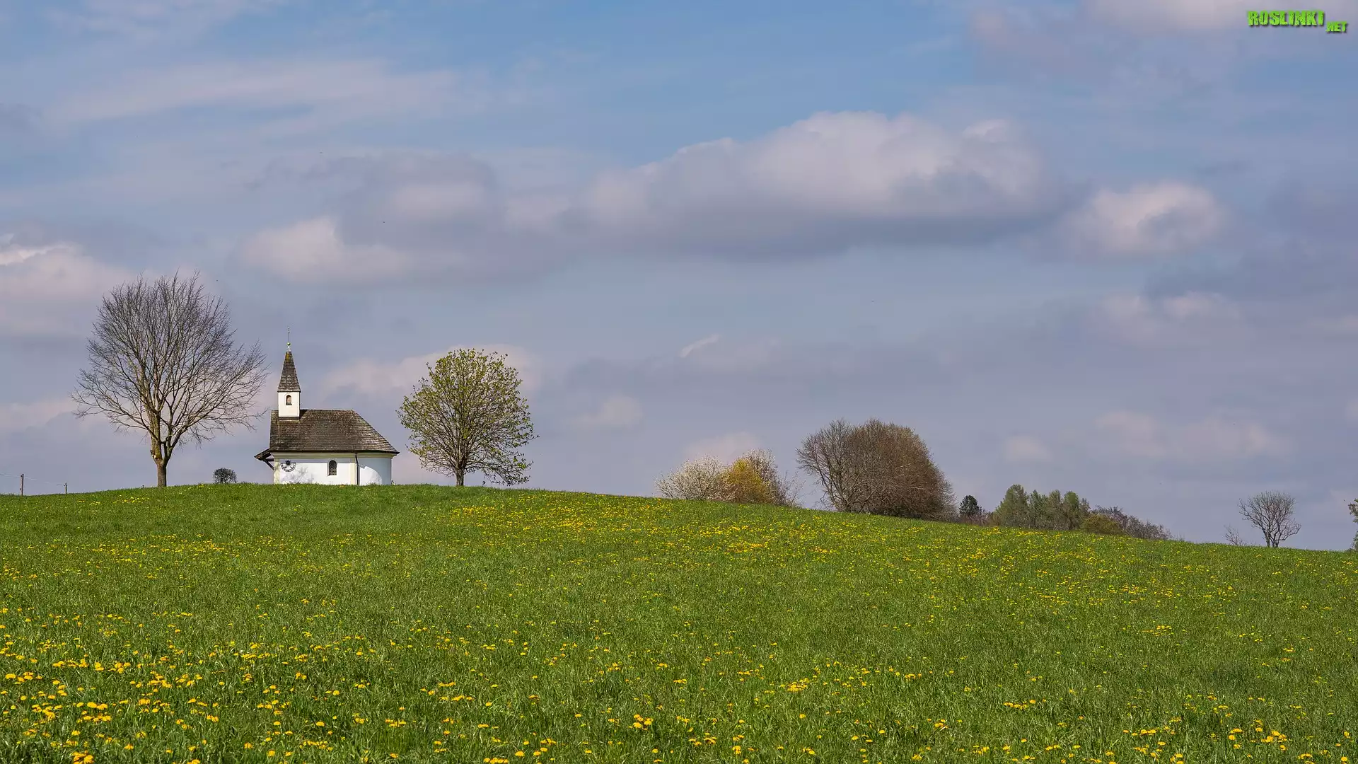 Rośliny: Wzgórze, Kościół, Kaplica, Drzewa, Łąka, Kwiaty, Wiosna