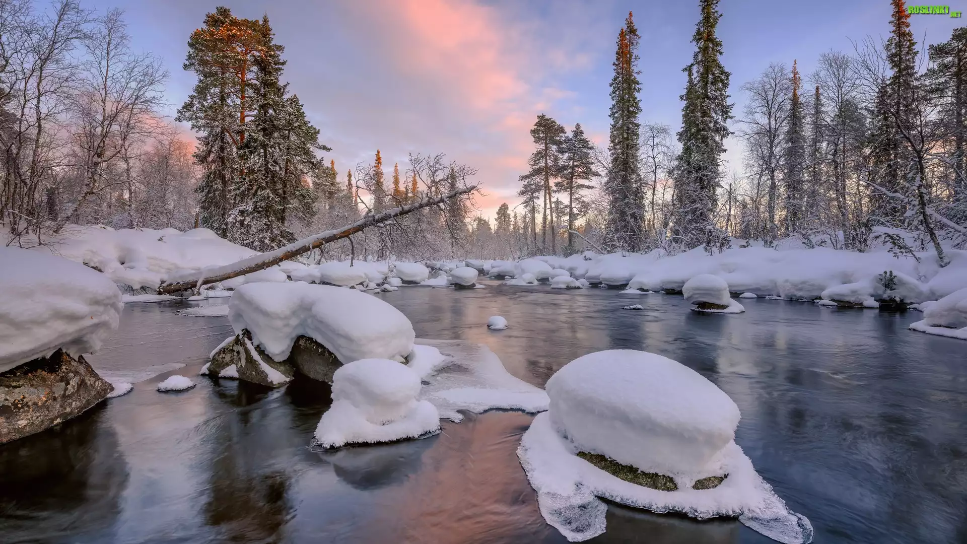 Rośliny: Rosja, Półwysep Kolski, Zima, Rzeka, Ośnieżone Kamienie, Drzewa