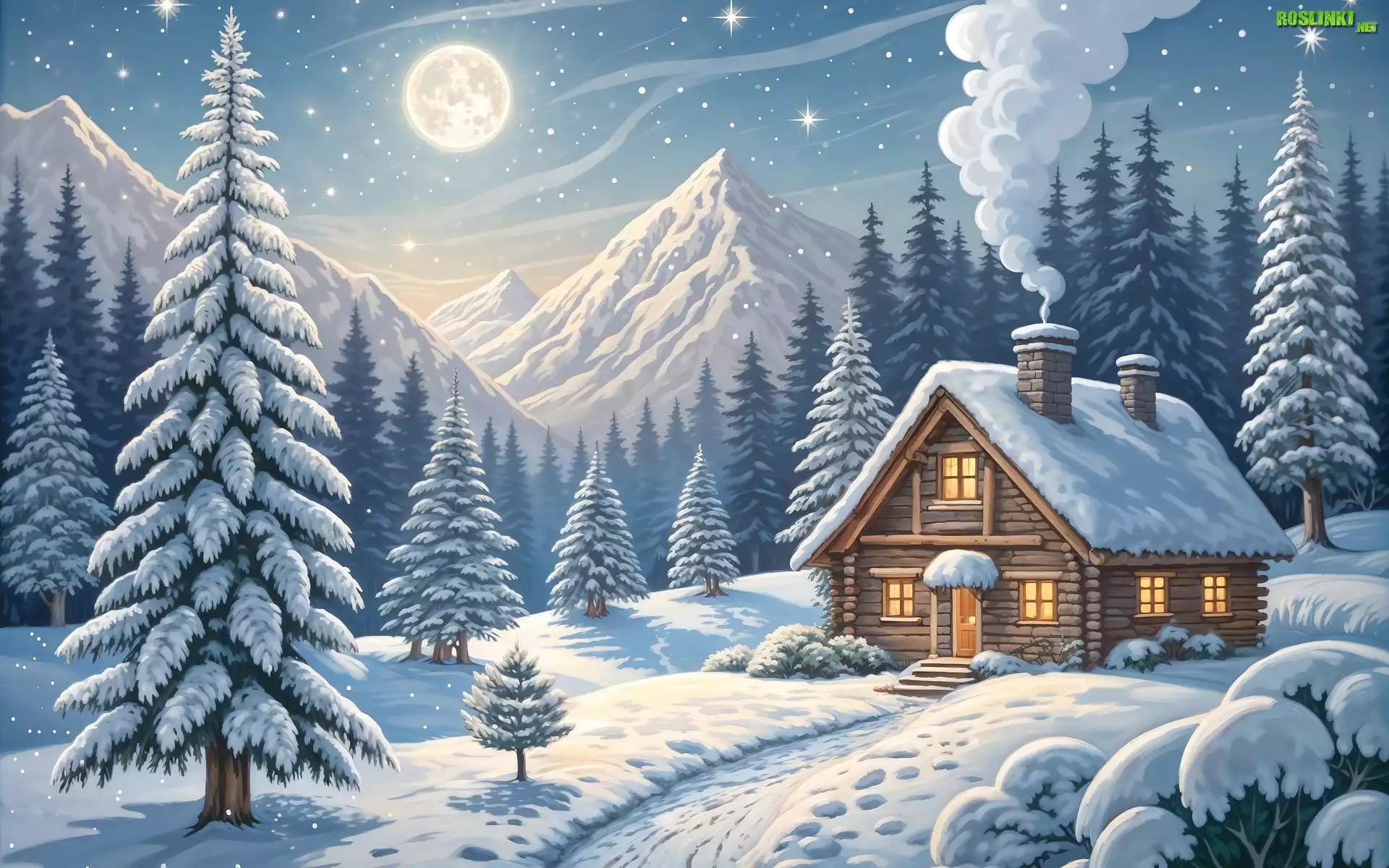 Rośliny: Grafika, Zima, Dom, Drzewa, Góry, Księżyc