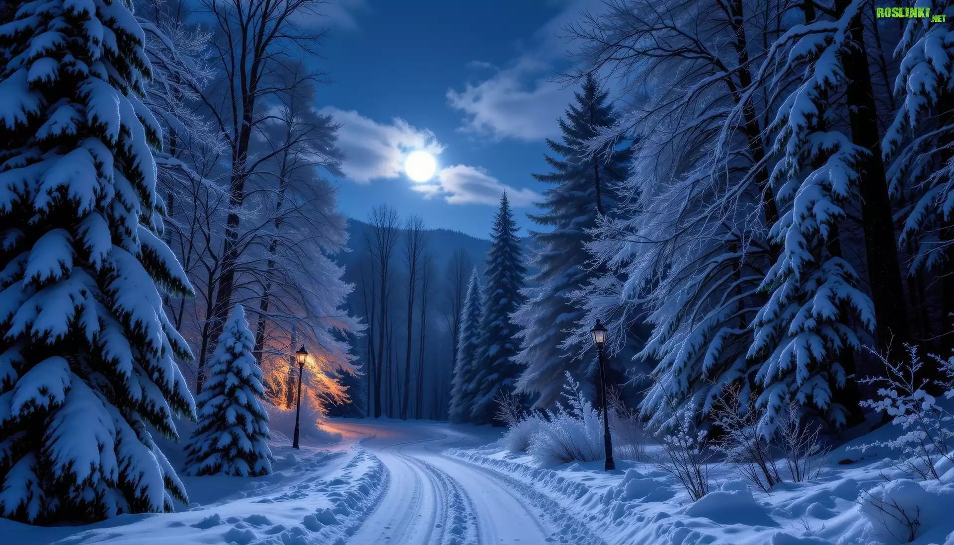 Rośliny: Zima, Droga, Ośnieżone, Drzewa, Światło, Księżyc