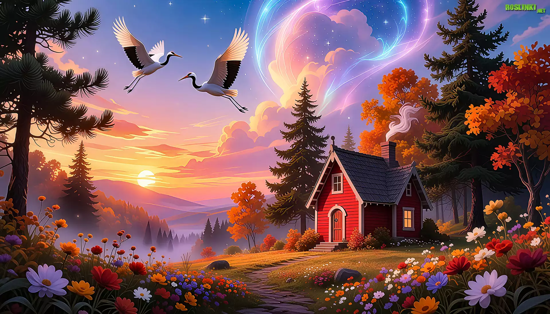 Rośliny: Czerwony, Domek, Kwiaty, Drzewa, Bociany, Grafika AI