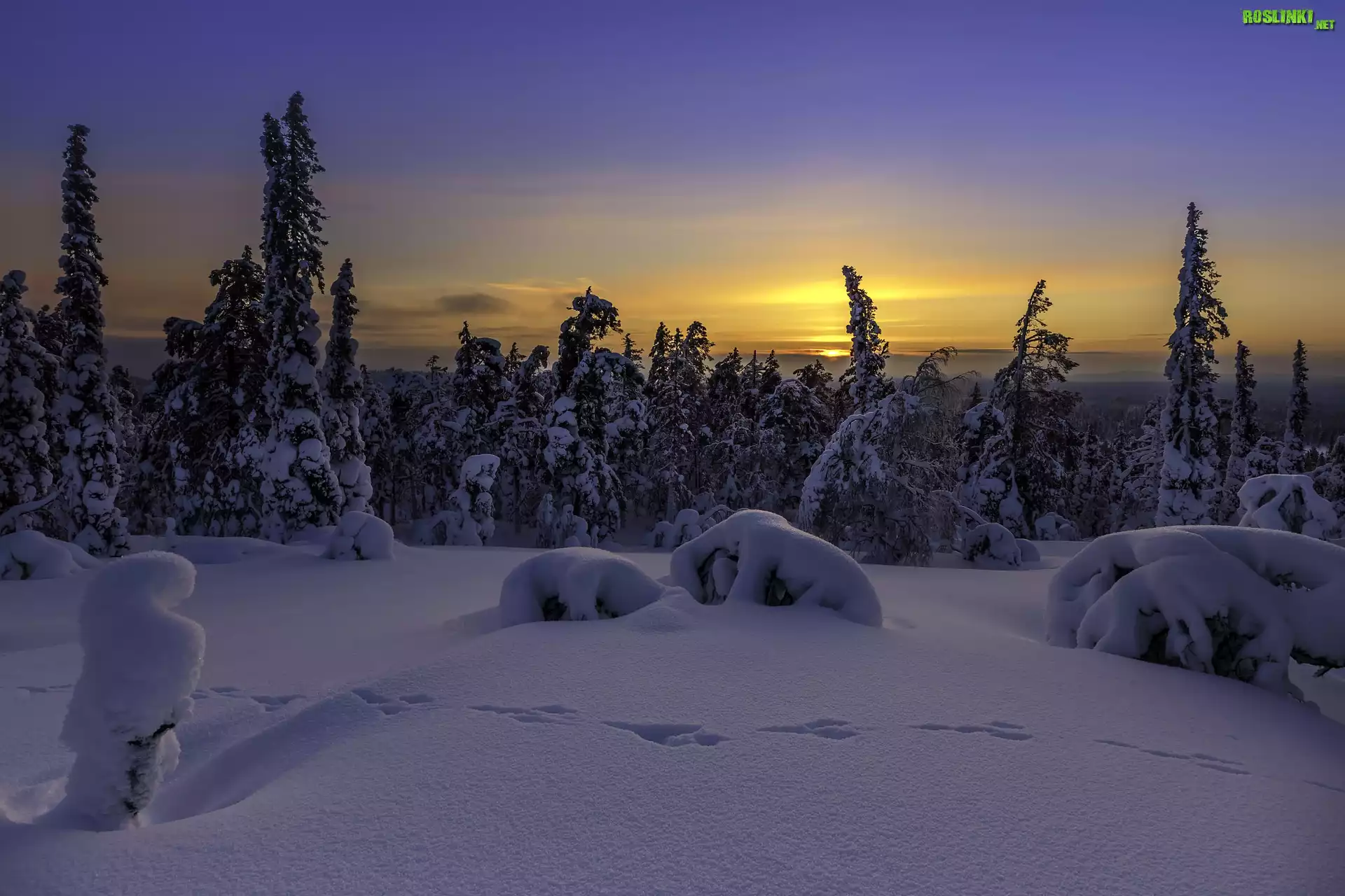 Rośliny: Ośnieżone, Drzewa, Zaspy, Zachód słońca, Zima, Śnieg, Ślady
