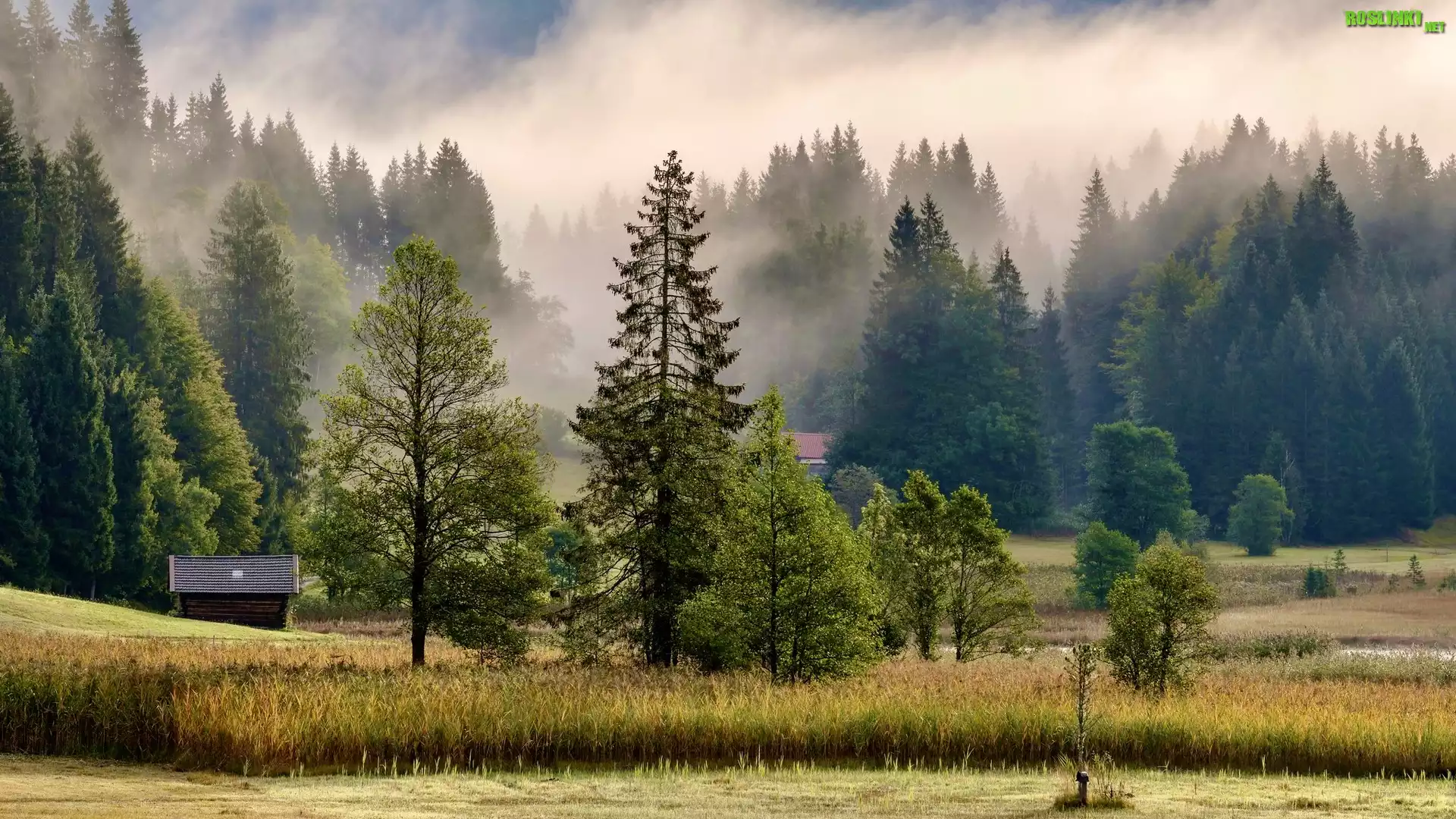 Rośliny: Las, Drzewa, Łąka, Mgła, Szopa