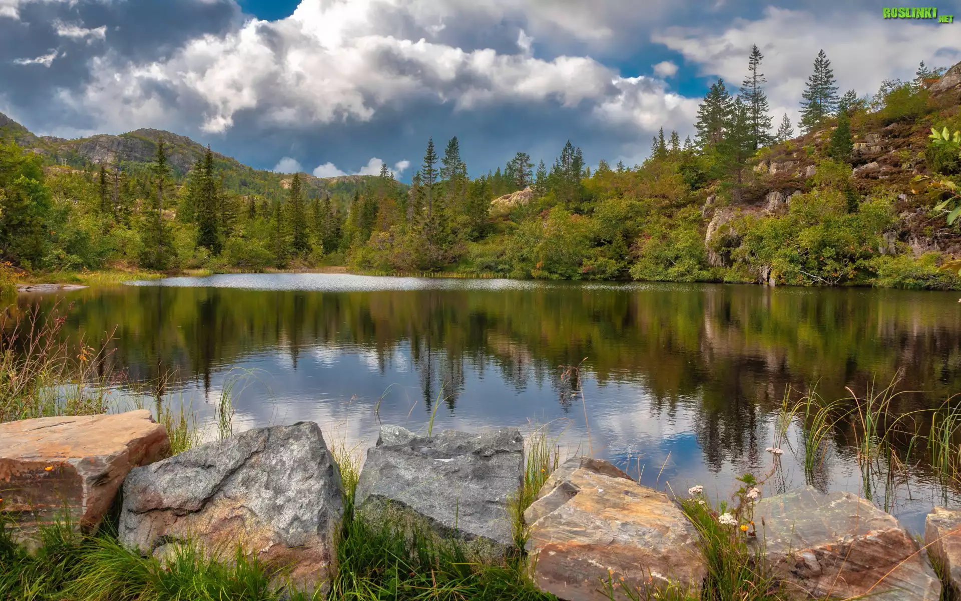 Rośliny: Góry, Drzewa, Las, Jezioro, Kamienie