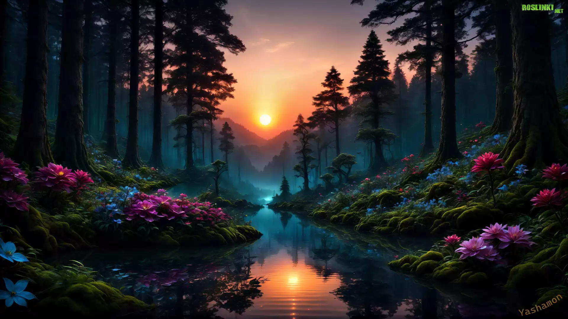 Rośliny: Rzeka, Kwiaty, Las, Drzewa, Zachód słońca, Grafika