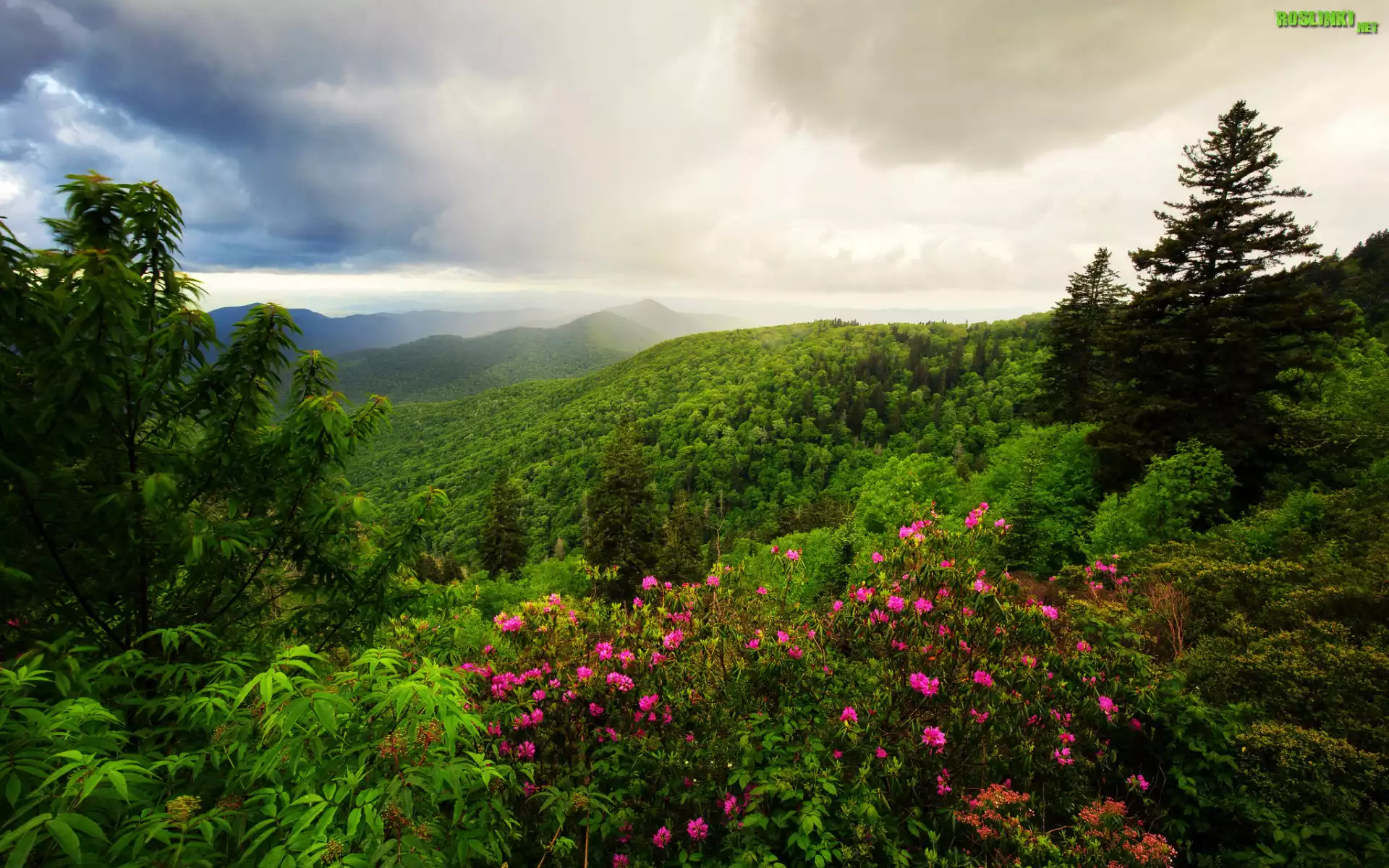 Las, Drzewa, Chmury, Góry, Appalachy, Kwiaty, Krzewy, Rododendrony, Karolina Północna, Stany Zjednoczone |