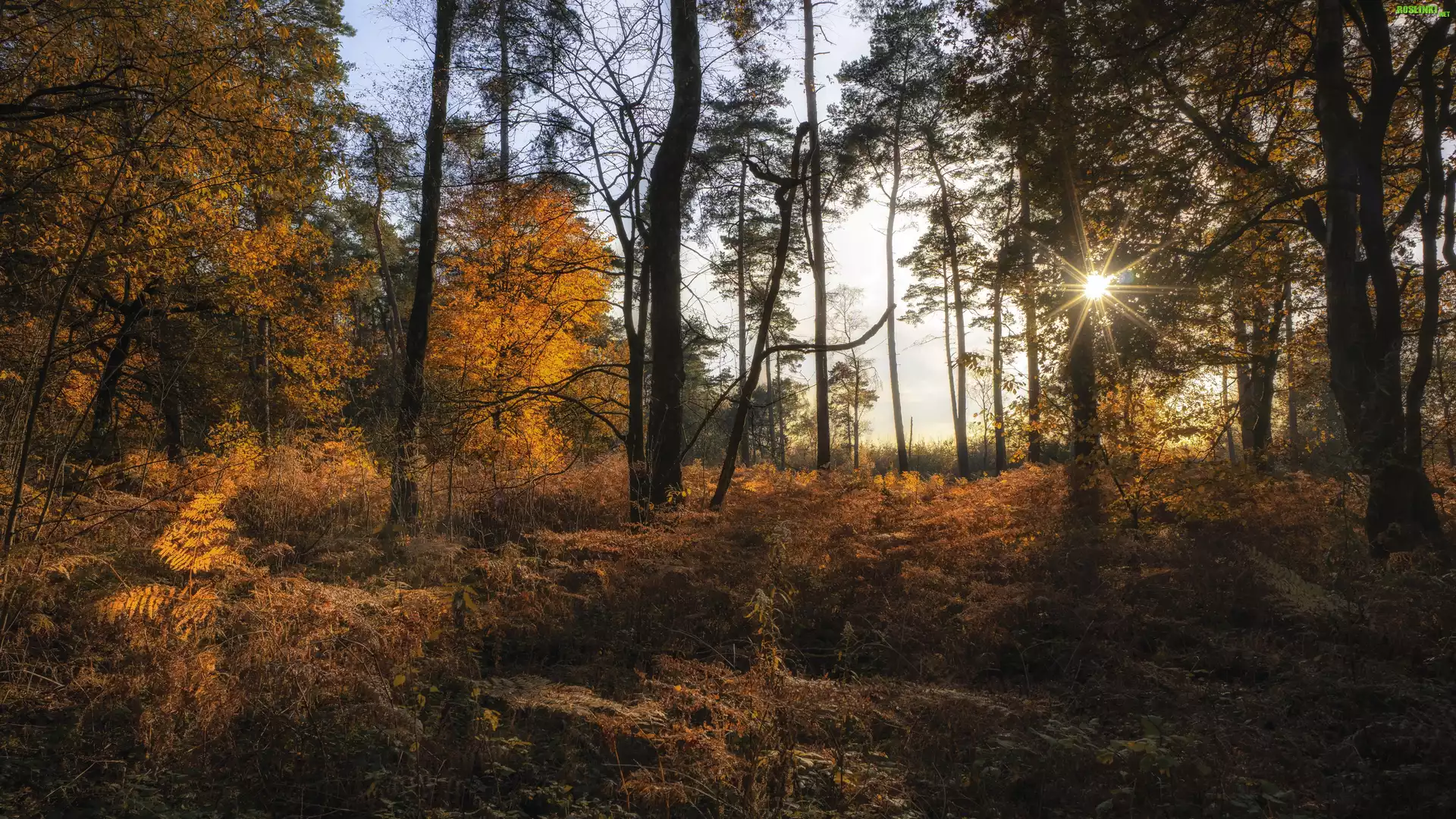 Rośliny: Las, Drzewa, Trawa, Mgła, Jesień, Promienie słońca
