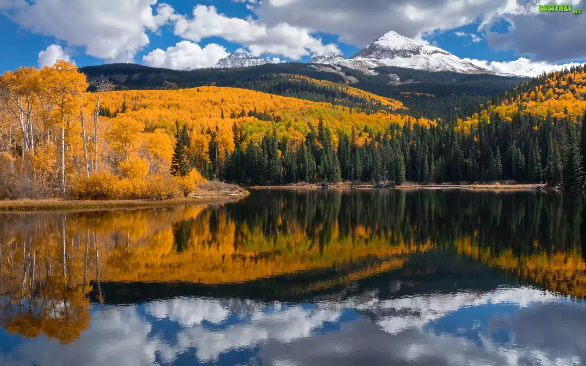 Rośliny: Góry, Jezioro, Lasy, Drzewa, Jesień, Chmury, Odbicie