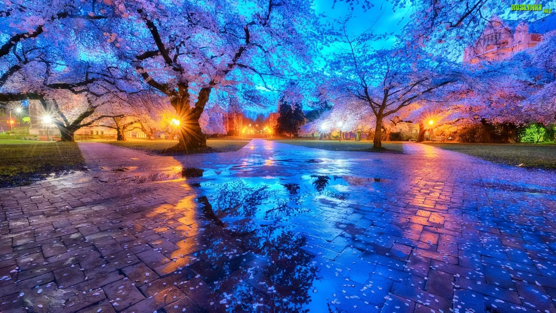 Rośliny: Wiosna, Drzewa, Kwitnące, Drzewa, Mokre, Chodniki, Park, Latarnie